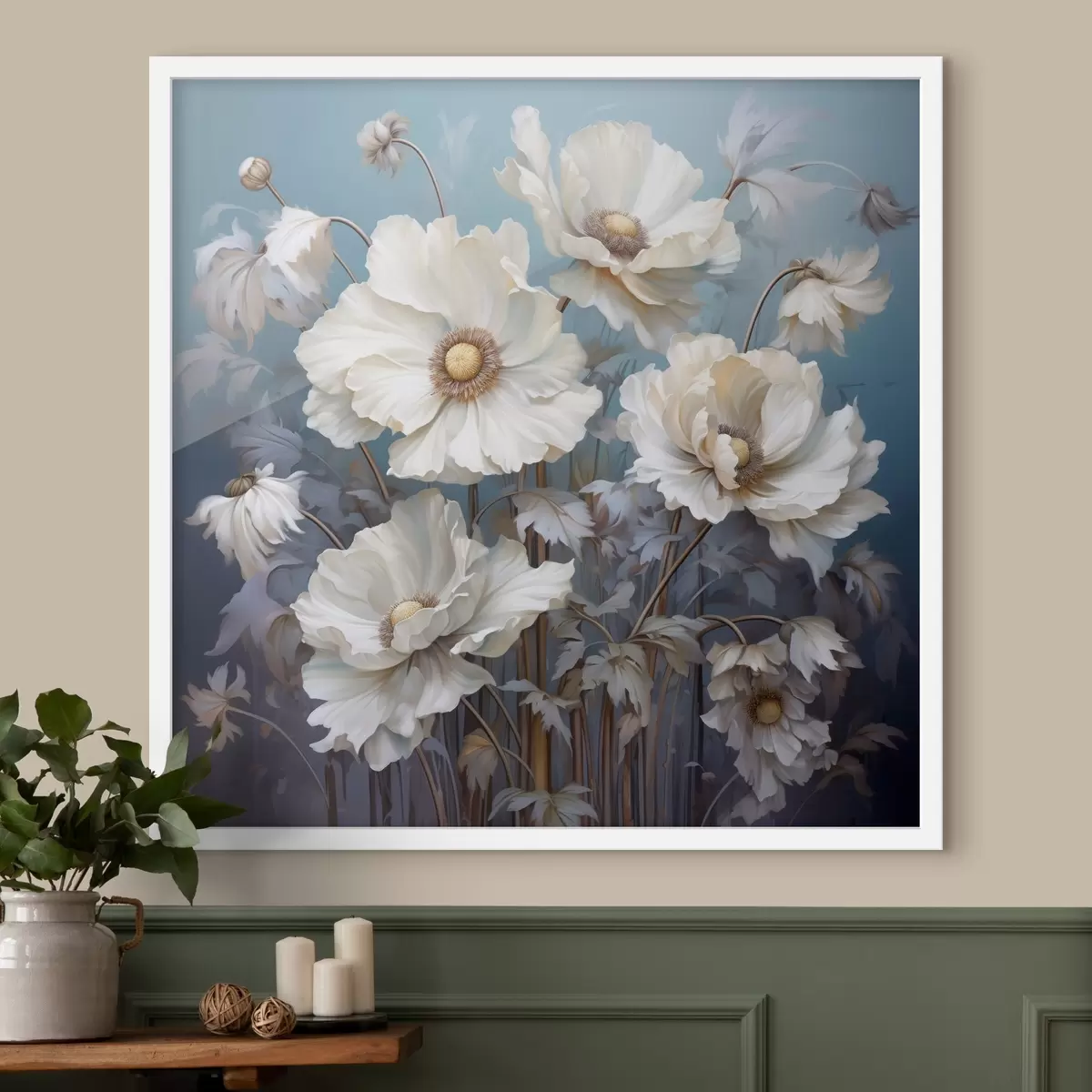Poster Valge kimp pojengid sinisel taustal maalimisstiilis Nr f43370