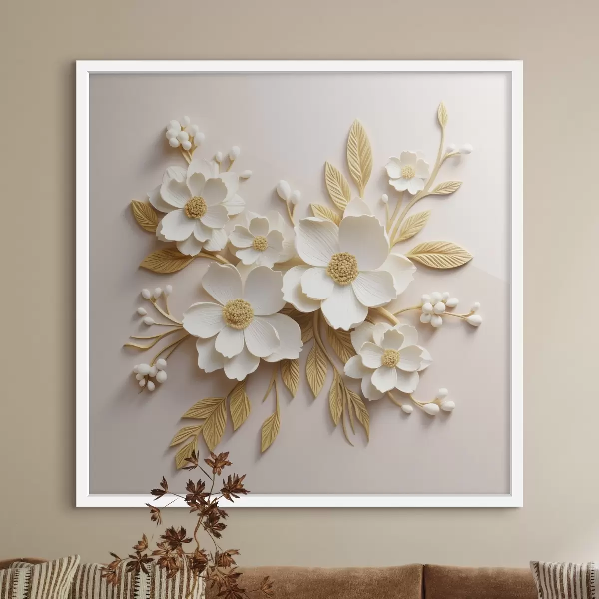 Plakat 3D valged lilled koos lehtedega kreemilisel taustal f43383