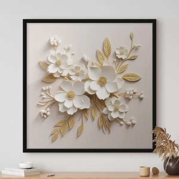 Poster 3D valged lilled koos lehtedega kreemilisel taustal Nr f43383