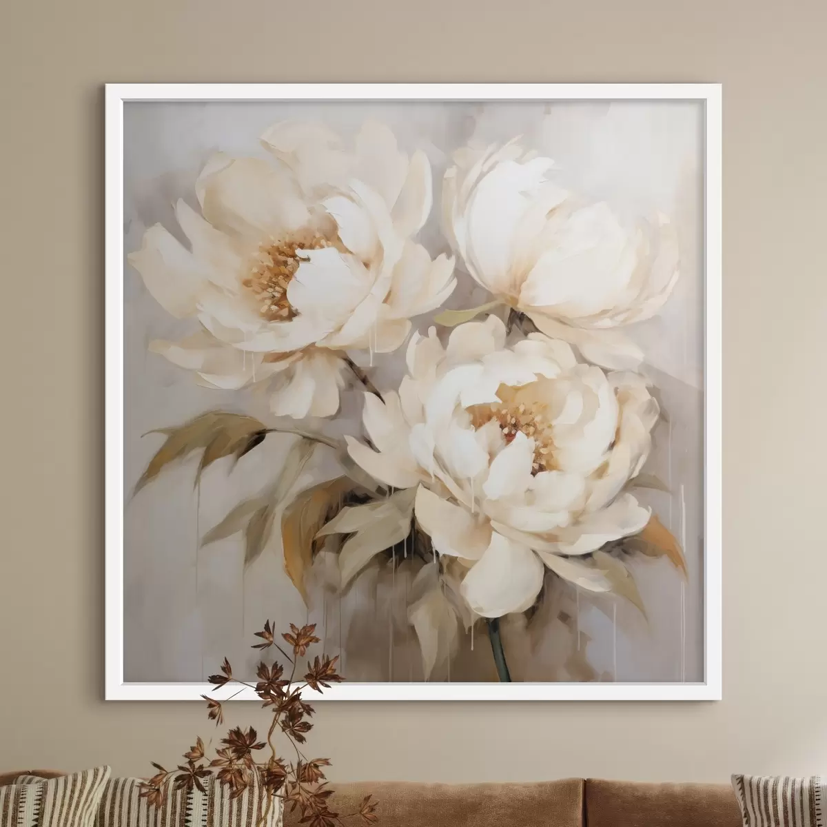 Plakat Õrnad pojengid neutraalsetes toonides abstraktses maalimisstiilis f43387
