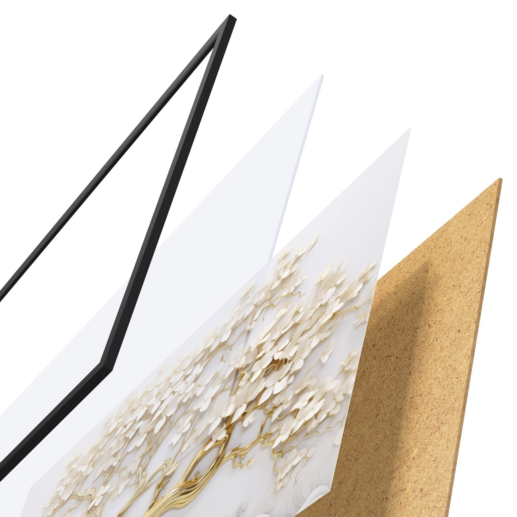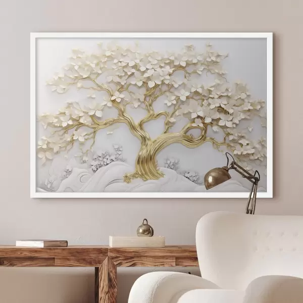 Plakat Dekoratiivne puu valgete lilledega, valge taust, valged kivid, keerulised detailid, loodusest inspireeritud kunst f43388