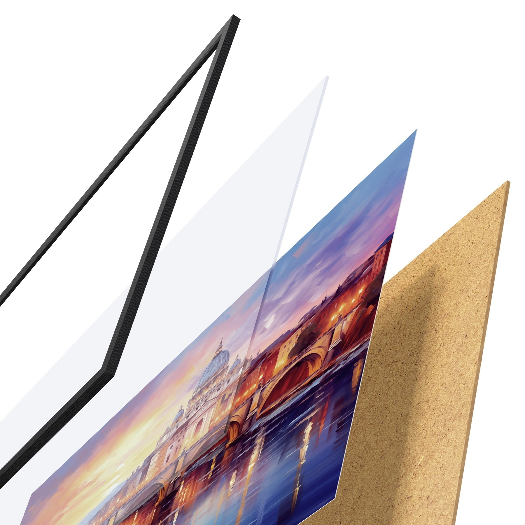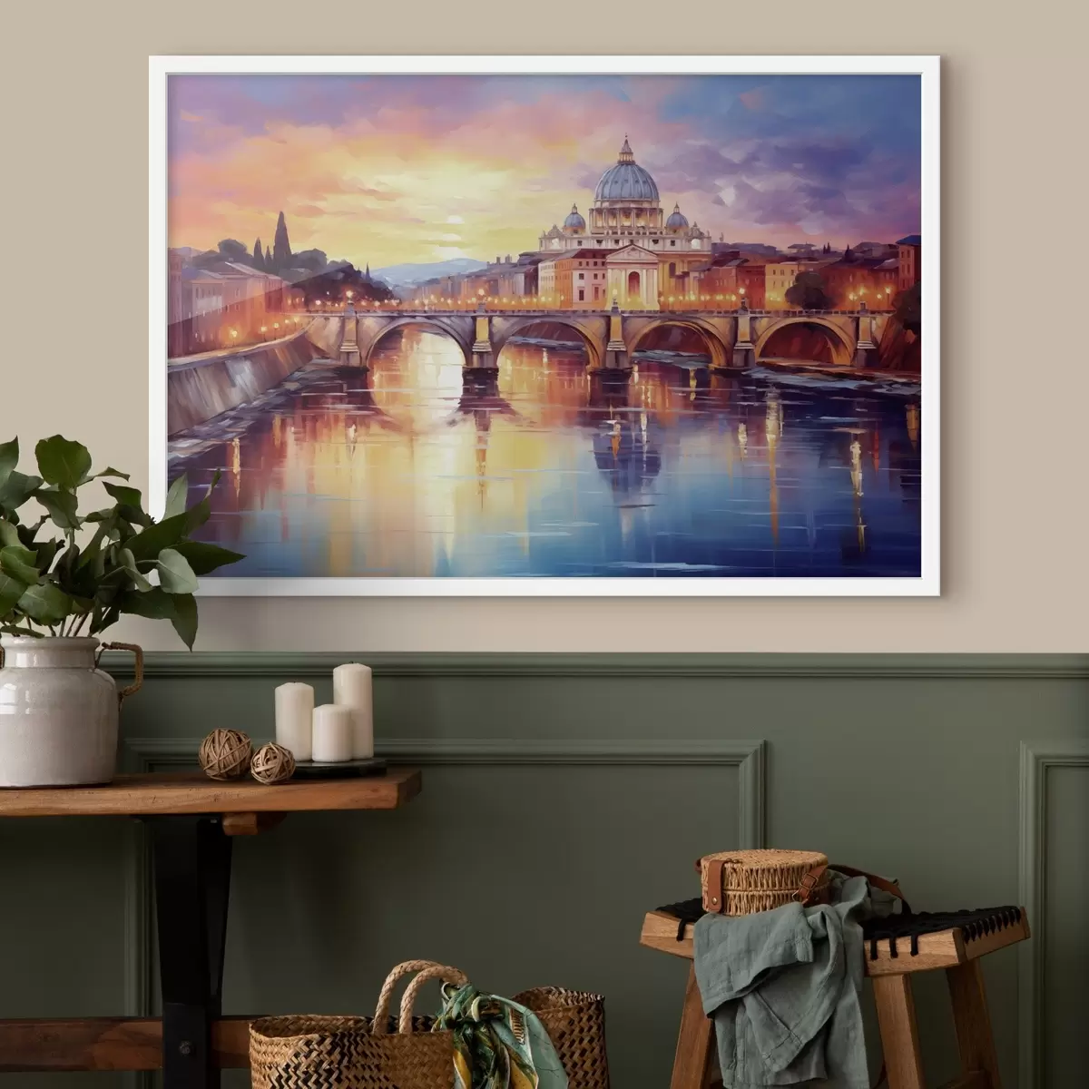 Plakat Püha Peetruse basiilika ja sild üle jõe päikeseloojangul, soojad värvid, peegeldus vees, õlimaali stiilis f43396