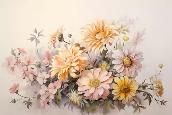 Plakat Roosa, kollase ja oranži värvi lillede kollektsioon, kerge taust, pehmed värvid, vintage stiilis, botaaniline illustratsioon f43401