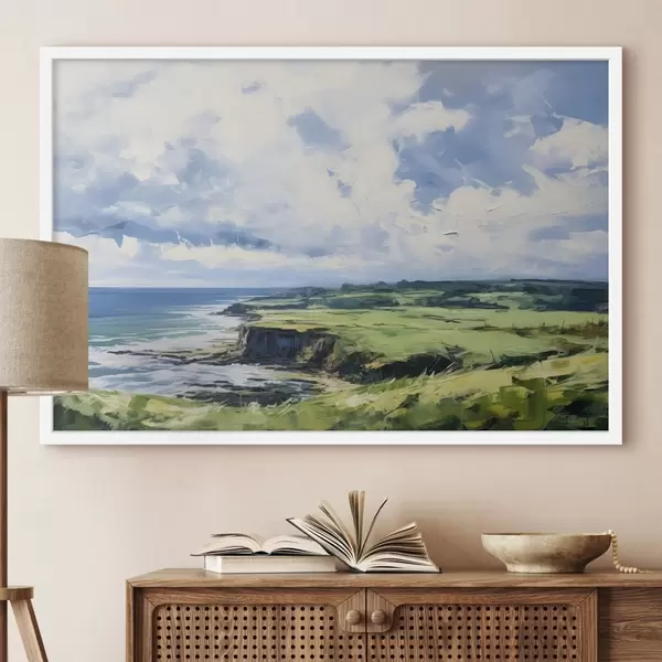 Plakat Roheline väli koos kaljuga rannikul, sinine meri koos lainetega, pilvine taevas, minimalistlik kaasaegne õlimaal imitatsioon f43406
