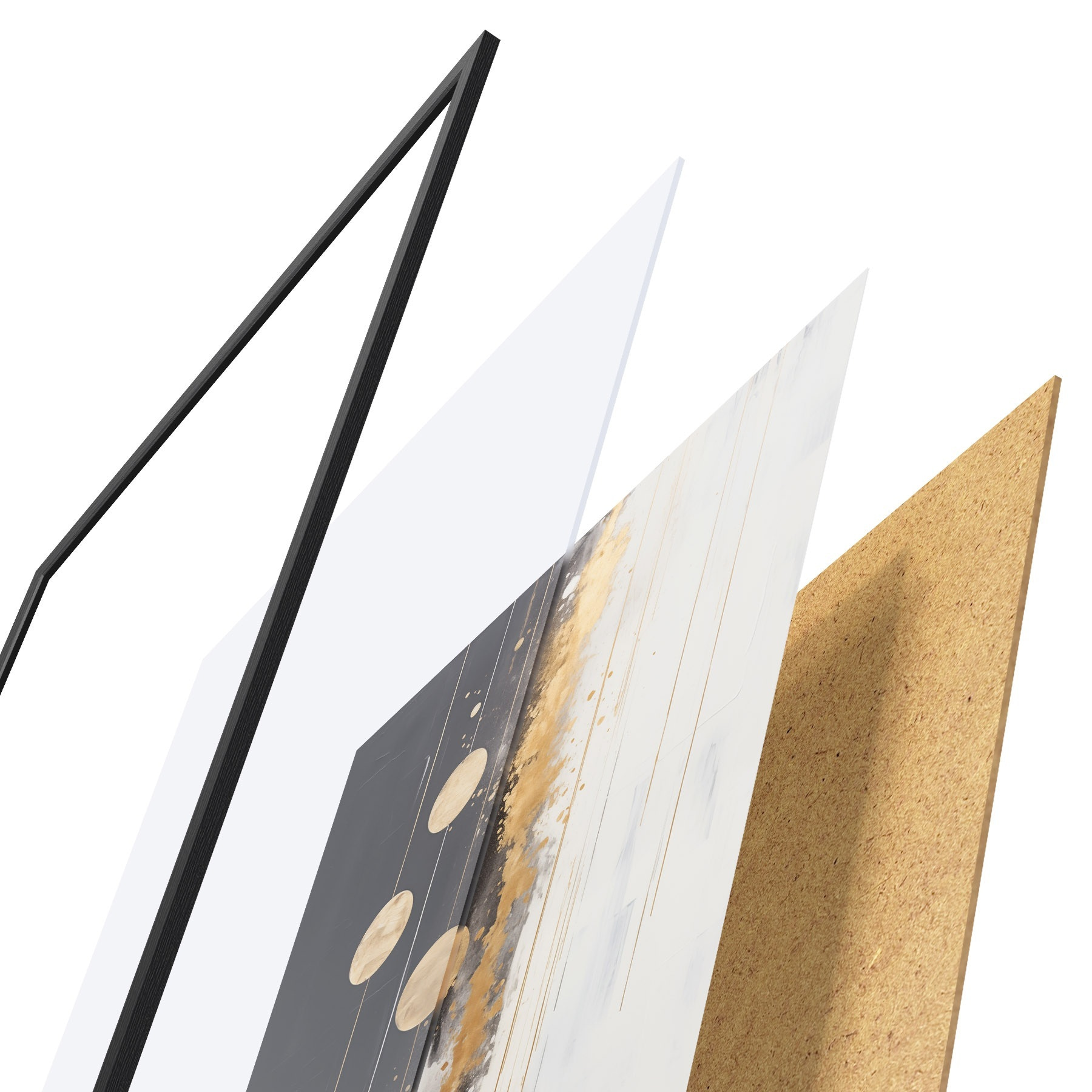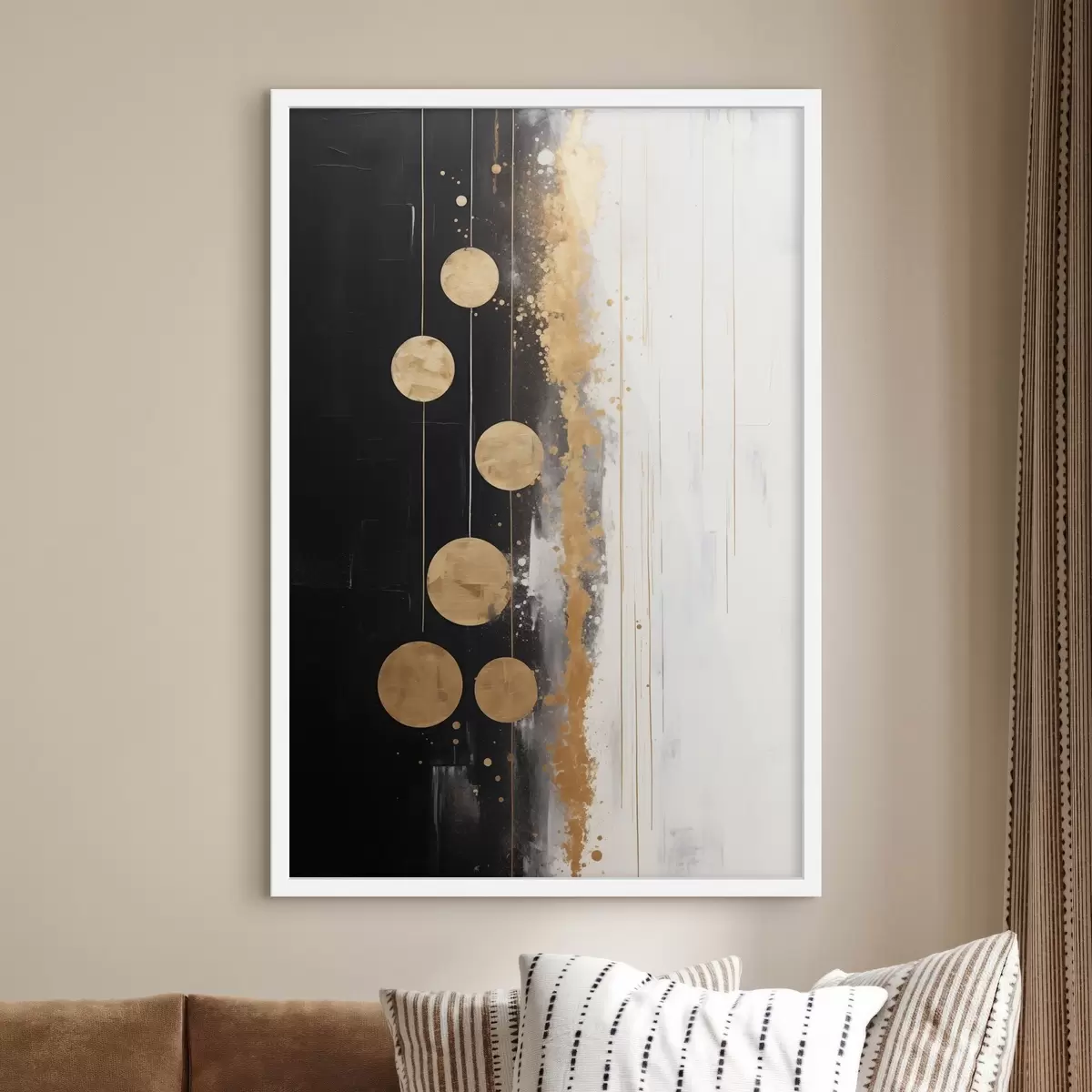 Poster Abstraktne kunst, kus kollased ringid ripuvad mustal ja valgel taustal koos valgete ja kollaste laikudega Nr f43410