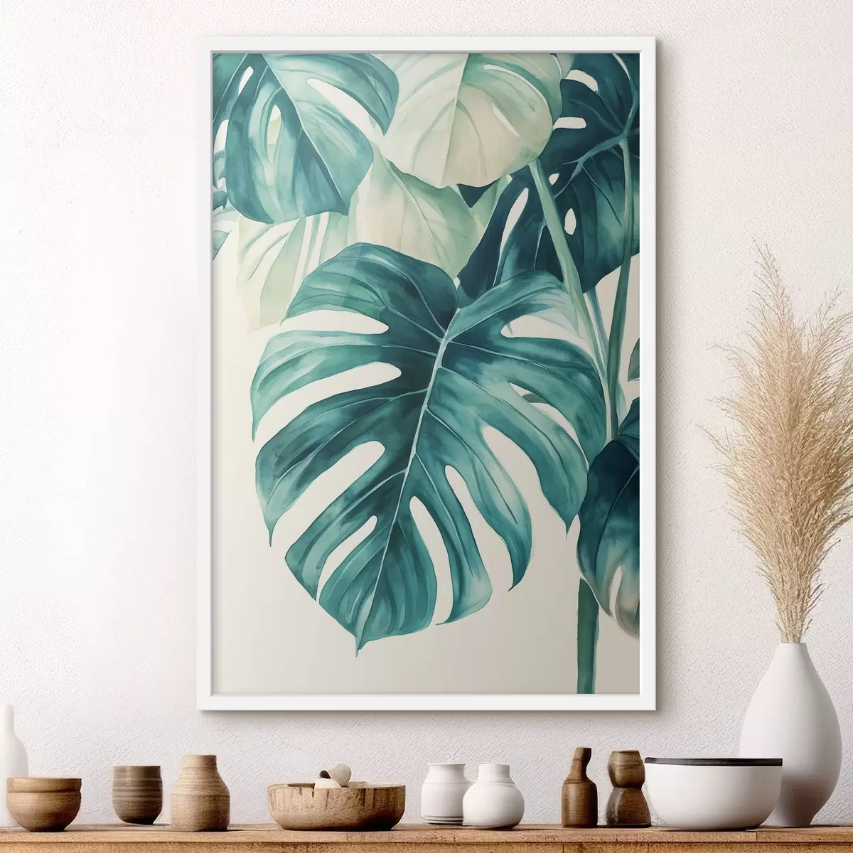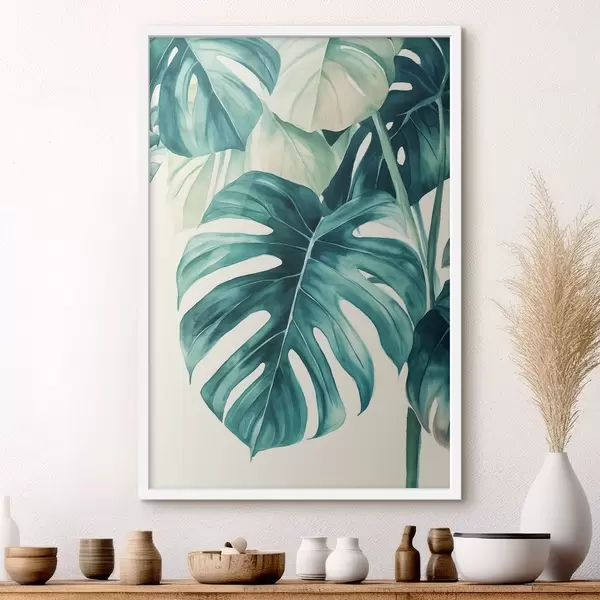 Plakat Monstera palmilehed, akvarellstiilis, lilleline, troopiline f43507