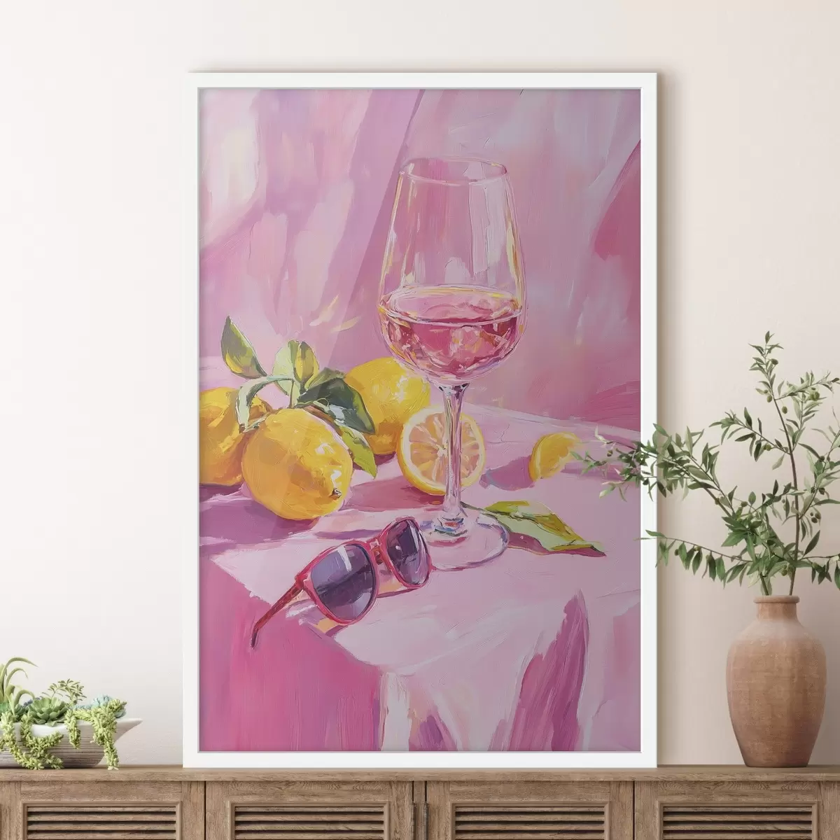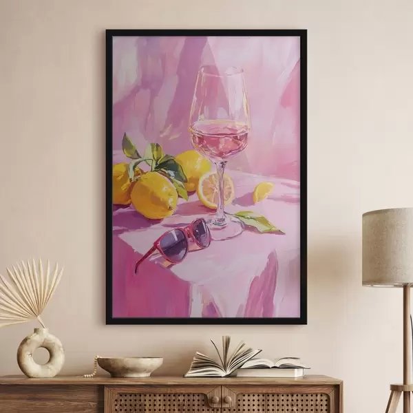 Plakat Klaas veini sidrunitega, päikeseprillid, abstraktsioon, õlistiilis joonistus, roosad värvid f43883