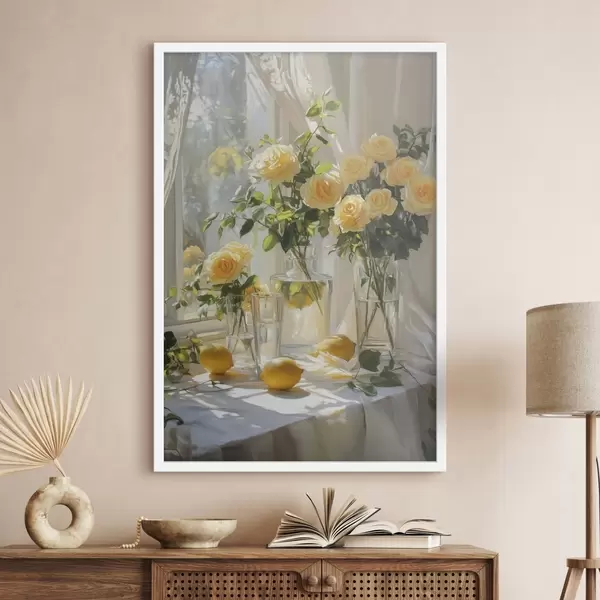 Plakat Roosid vaasides, õlistiilis joonistus, õrn päikesevalgus, sidrunid, kevad f43887