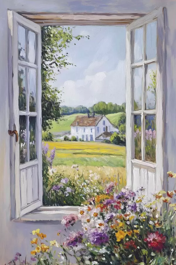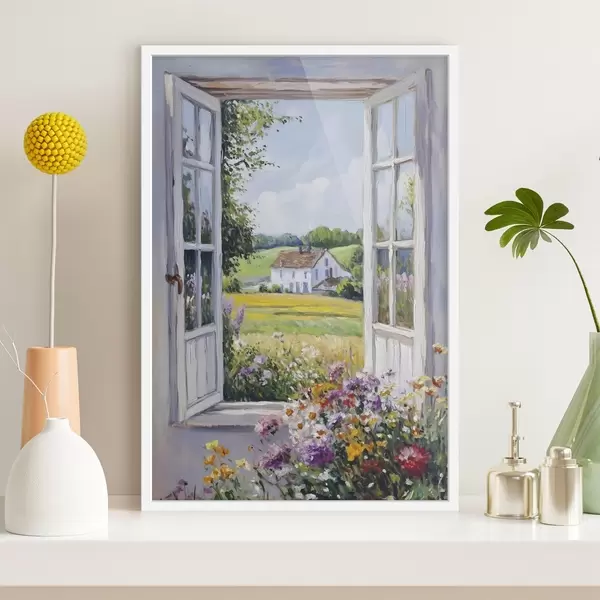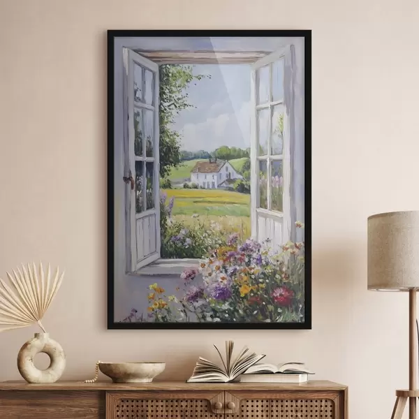 Poster Küla maastikud puitaknas, lilled, põllud, õlistiilis, talumaja Nr f43888