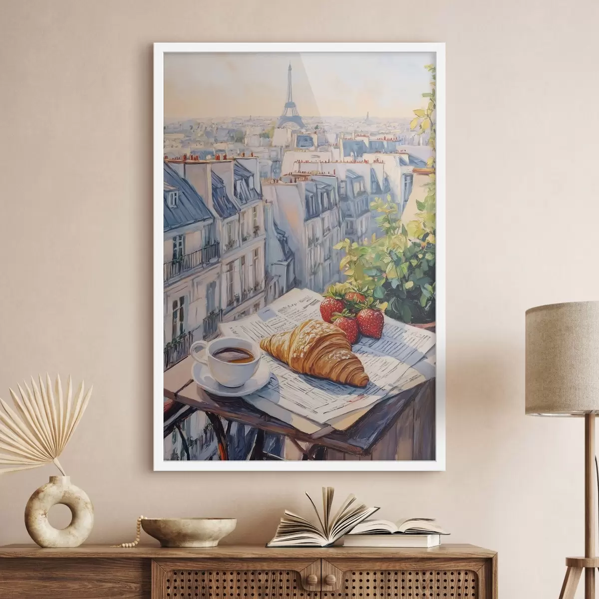 Plakat Päikesetõus Pariisis rõdul, Eiffeli torn, maasikad, kohv, päevik f43890