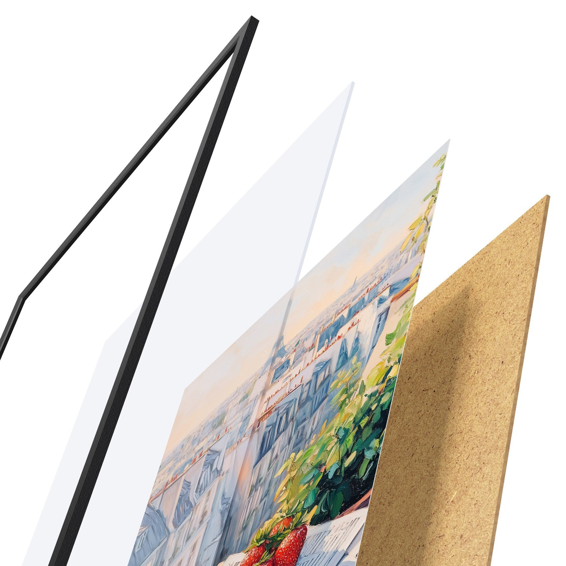 Poster Päikesetõus Pariisis rõdul, Eiffeli torn, maasikad, kohv, päevik Nr f43890