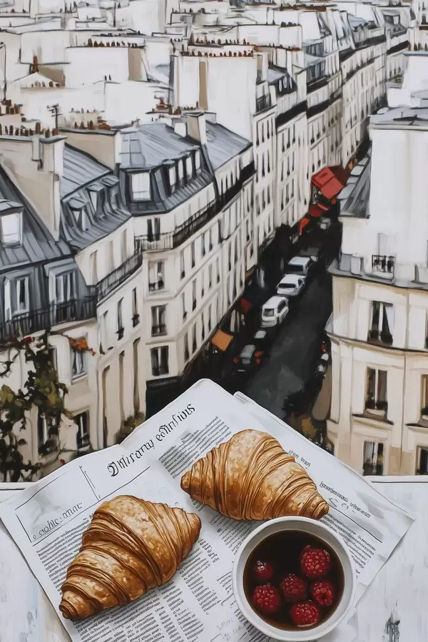 Poster Hommikukohv croissantidega, linnatänav, arhitektuurne, õlistiilis Nr f43891