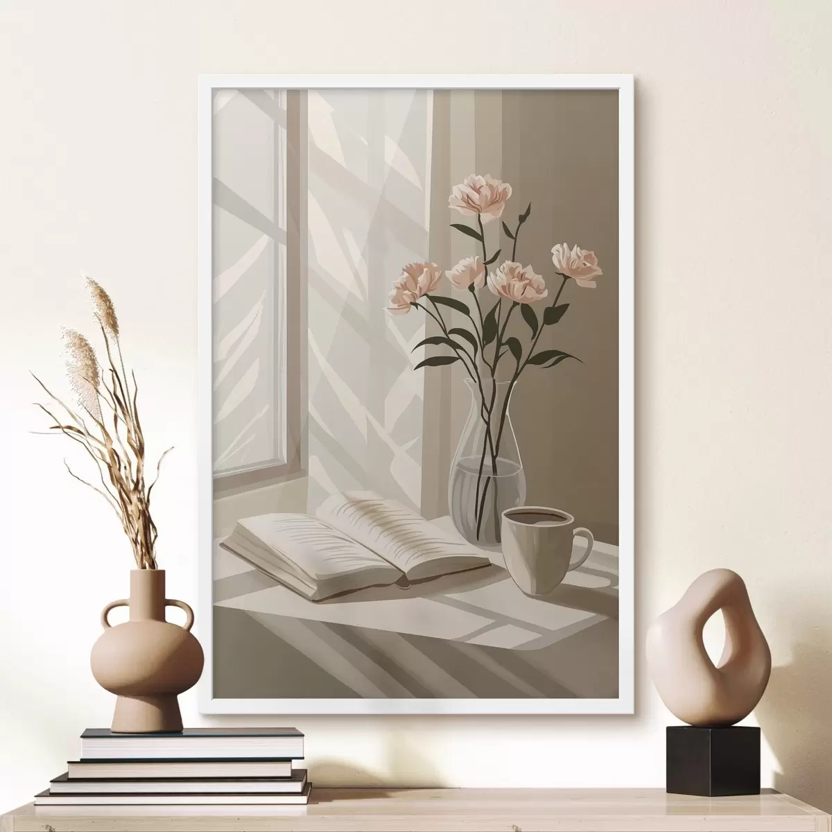 Plakat Hubane hommik kohvi ja raamatuga, roosad lilled, abstraktsioon f44013