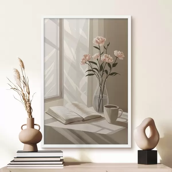 Poster Hubane hommik kohvi ja raamatuga, roosad lilled, abstraktsioon Nr f44013