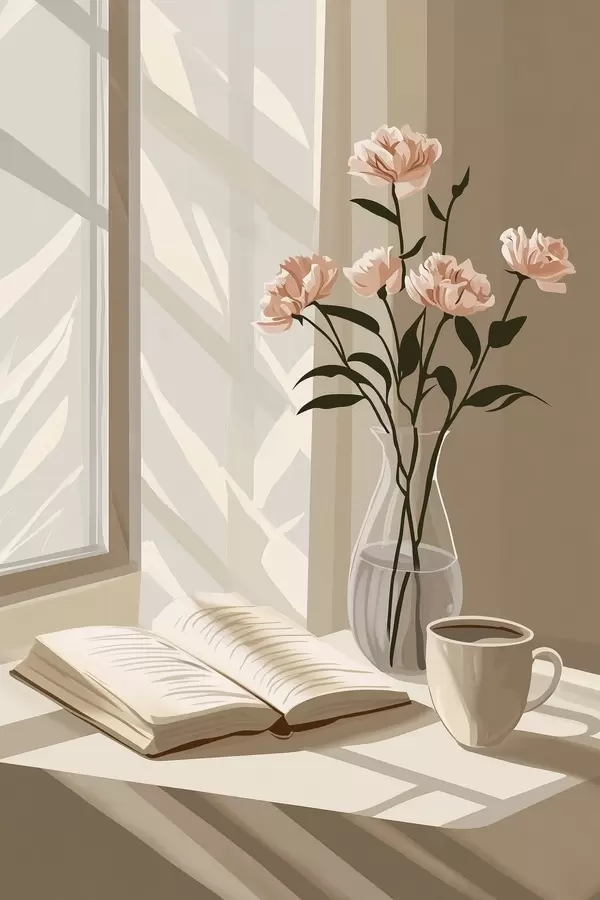 Poster Hubane hommik kohvi ja raamatuga, roosad lilled, abstraktsioon Nr f44013