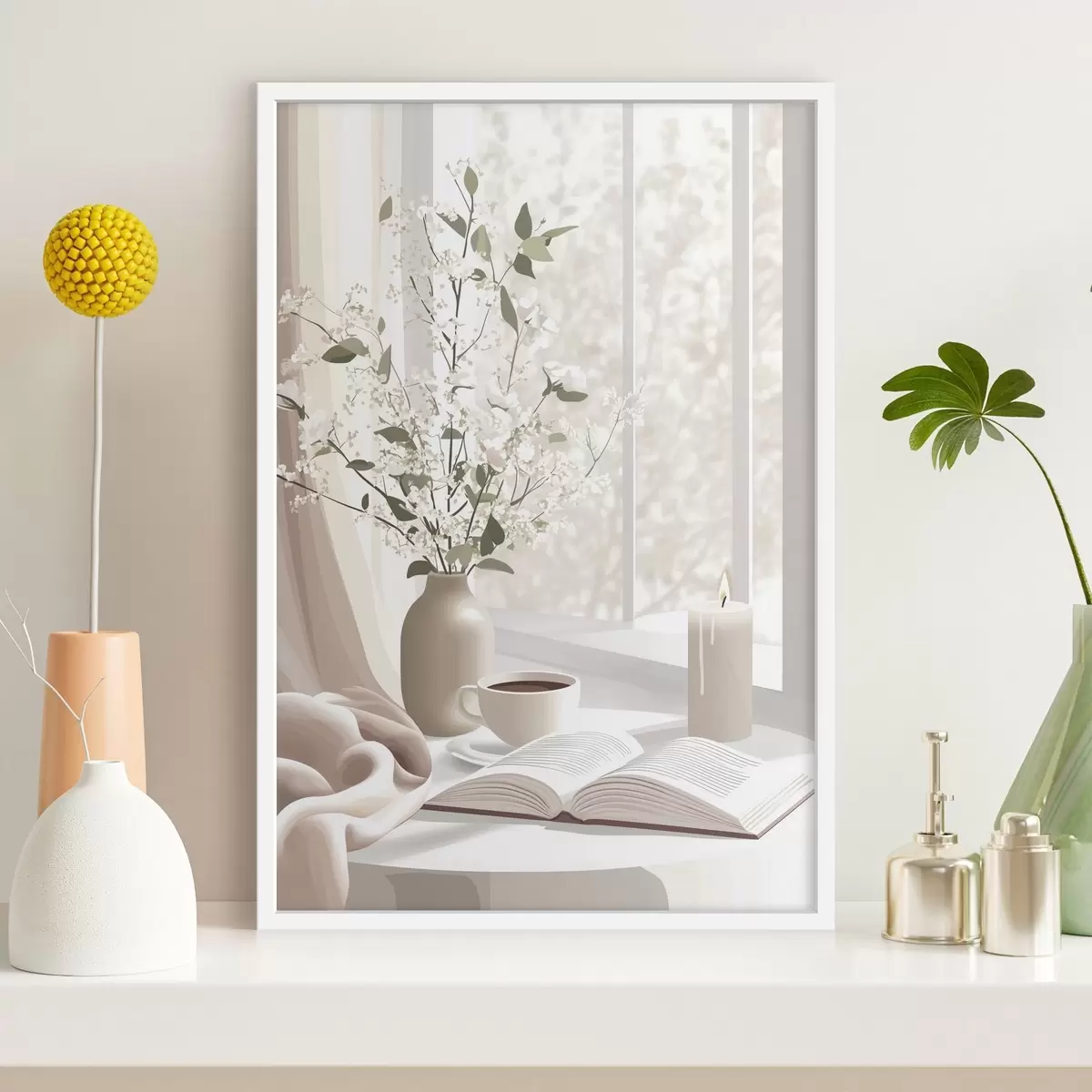 Plakat Kevadine hommik kohvi ja lilledega, pehmed pastelsed värvid f44015
