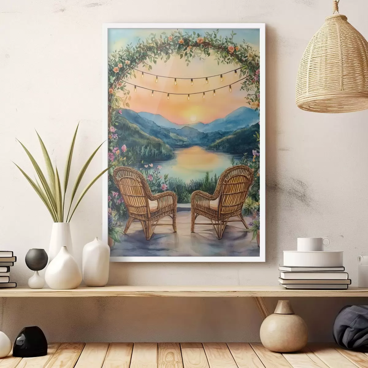 Poster Punutud toolid päikeseloojangul, mägede maastik, boho stiilis Nr f44020