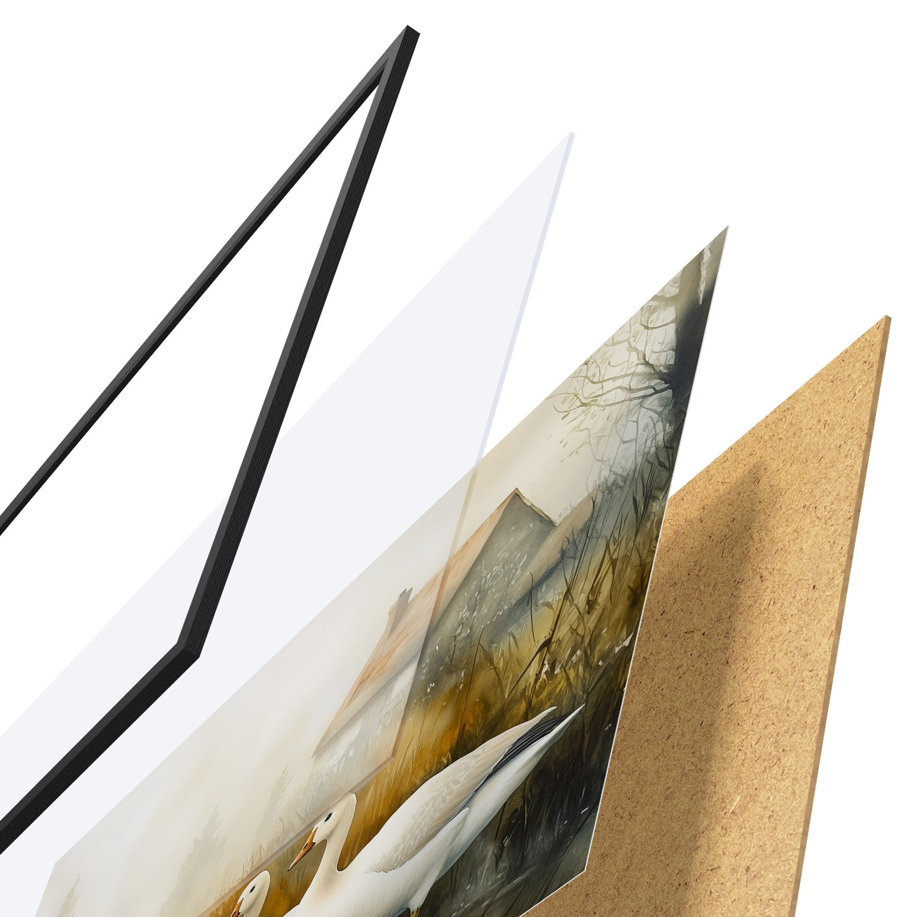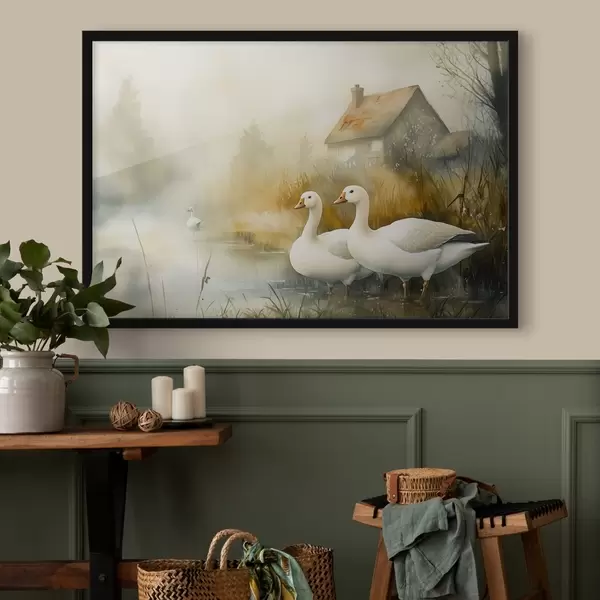 Poster Haned järve ääres talumaja lähedal, maaliline, akvarellstiilis Nr f44022