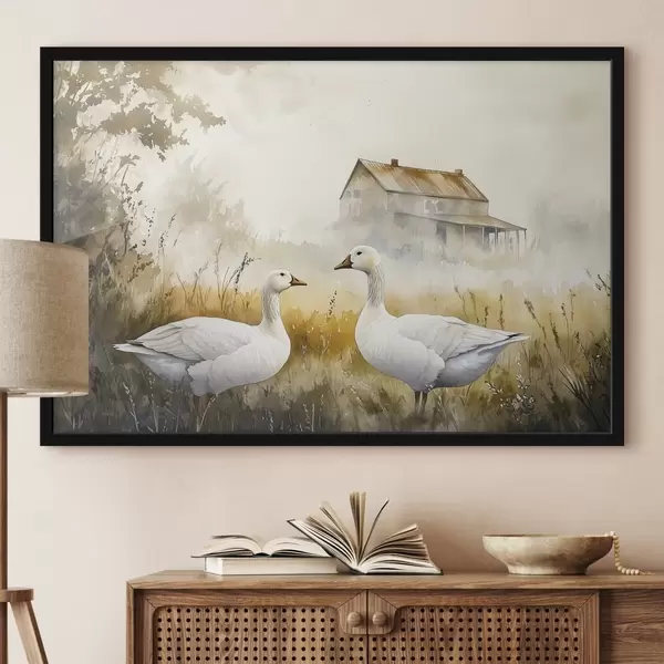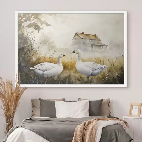 Plakat Akvarell stiilis haned põllul, küla, maaliline f44024