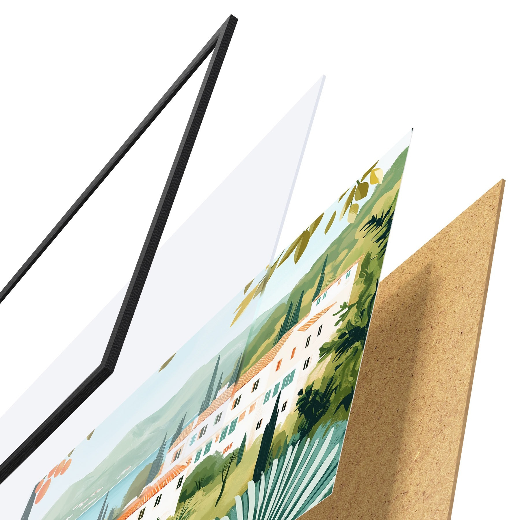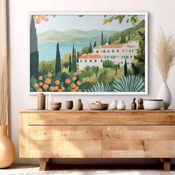 Plakat Vahemeremaastikud apelsinipuude ja majadega, mererannik f44027