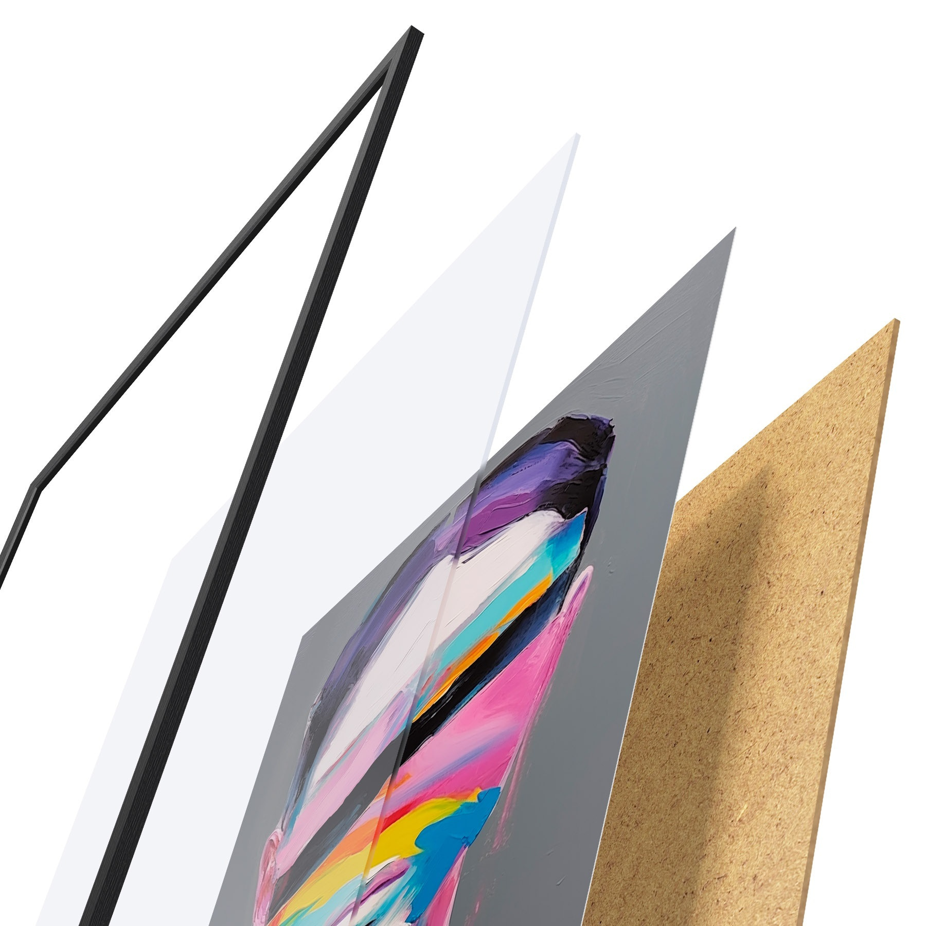 Plakat koosneb raamist, pleksiklaasist, trükitud pildist ja puitlaastplaadist alusplaadist. Tänu tagaküljel olevatele kinnitustele saab plakati kohe seinale riputada.