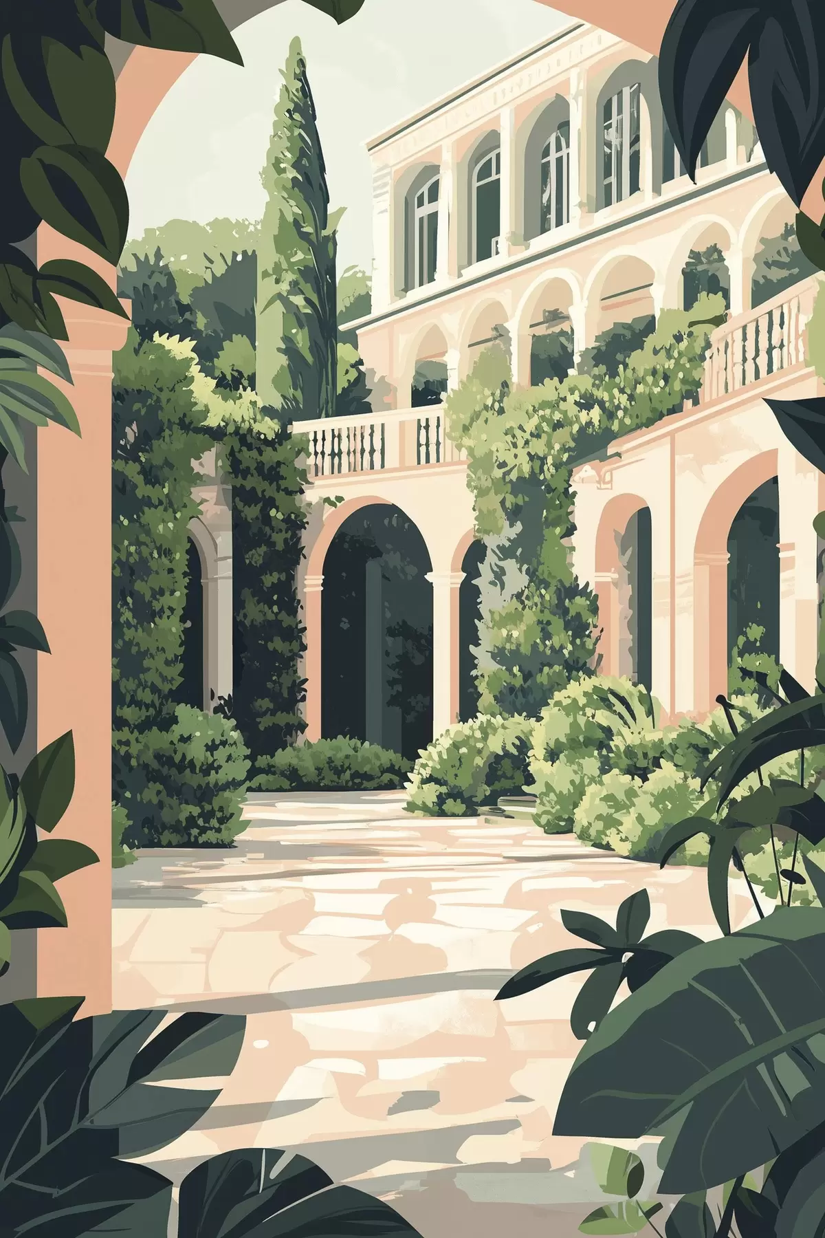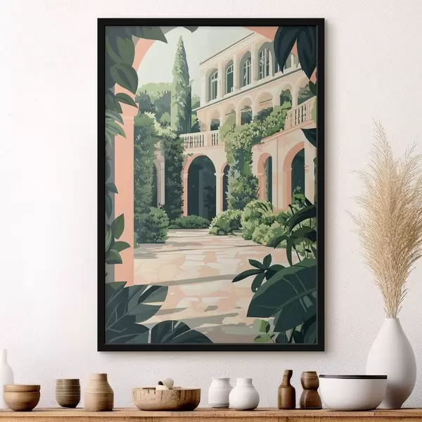 Poster Vahemere arhitektuur, troopiline loodus, kortermaja, villa koos aiaga Nr f44150