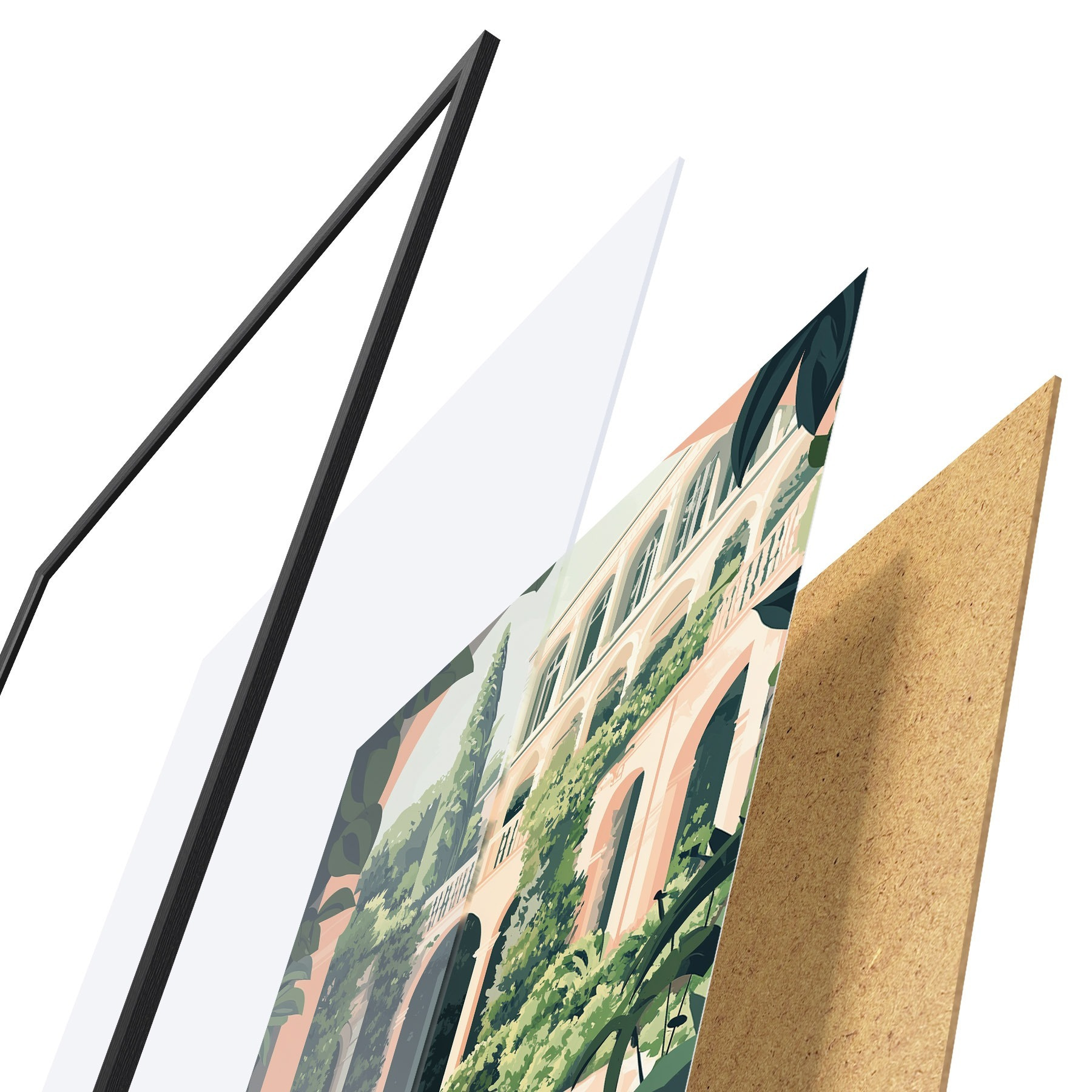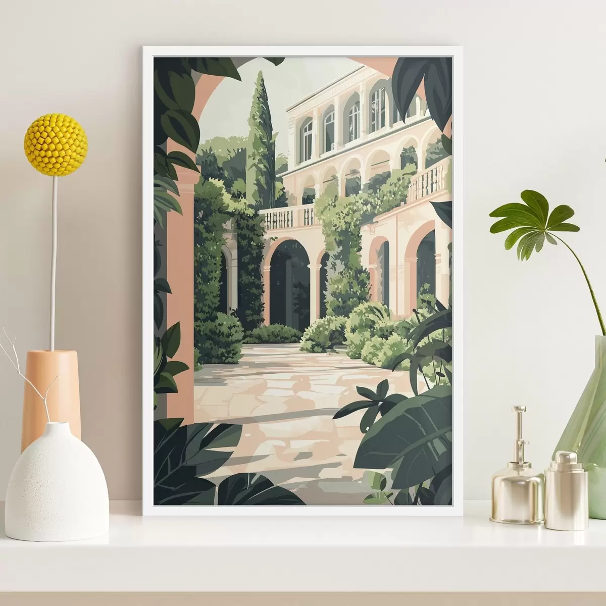 Plakat Vahemere arhitektuur, troopiline loodus, kortermaja, villa koos aiaga f44150