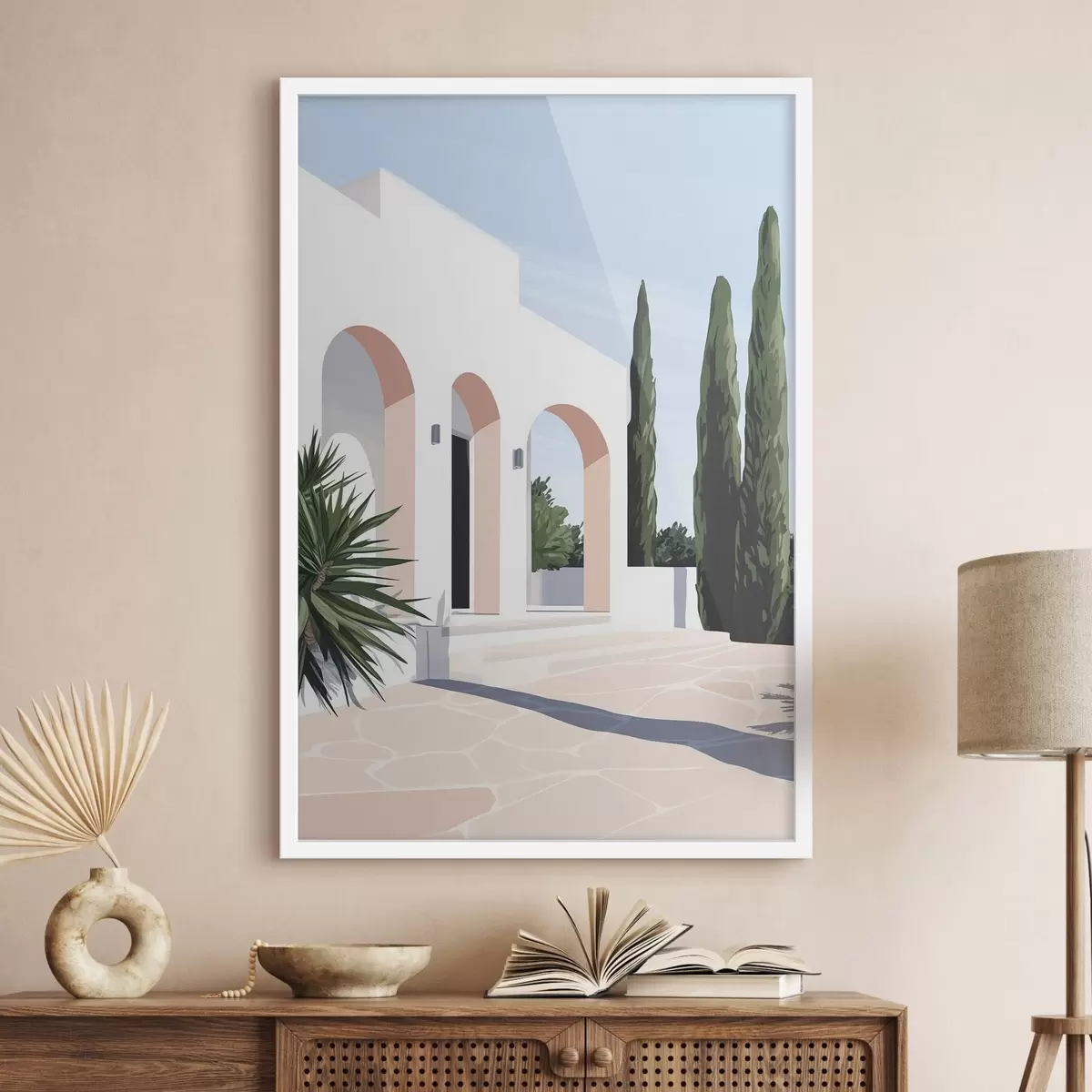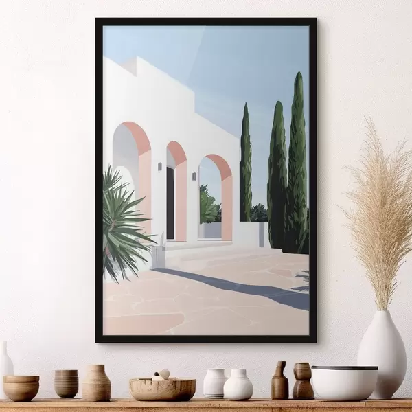 Poster Valge villa võlvidega ja troopilise aiaga, vahemereline, korteriga stiil Nr f44153