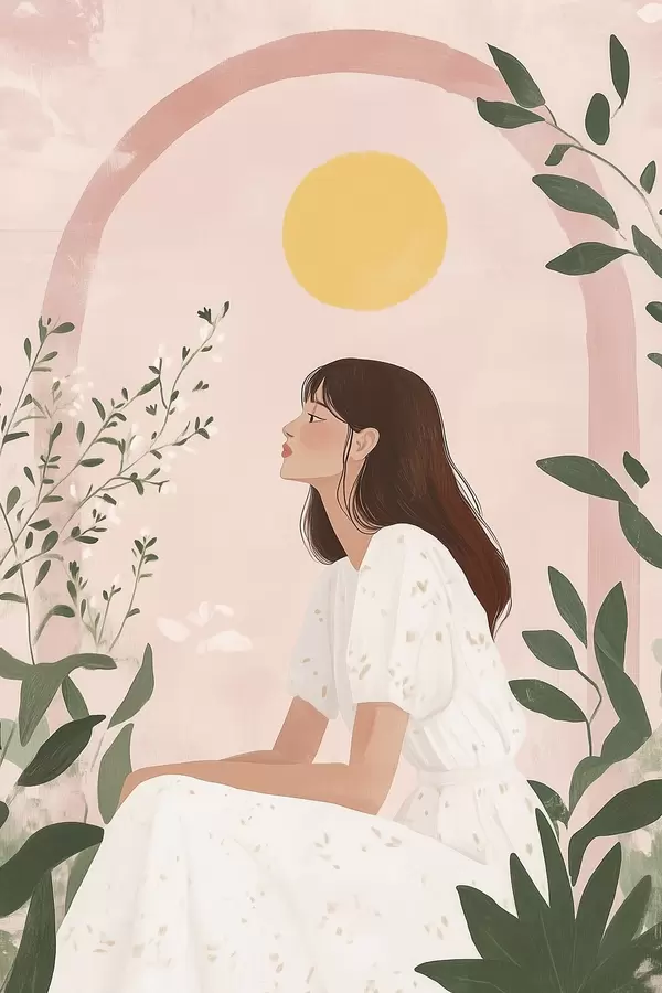 Poster Ilus naine troopilises aias, päike, pastelsed värvid Nr f44155