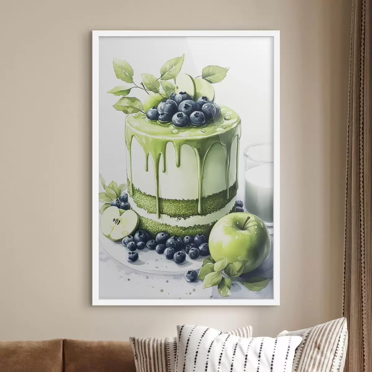 Plakat Matcha kook mustikate ja õuntega, akvarellistiilis f44304