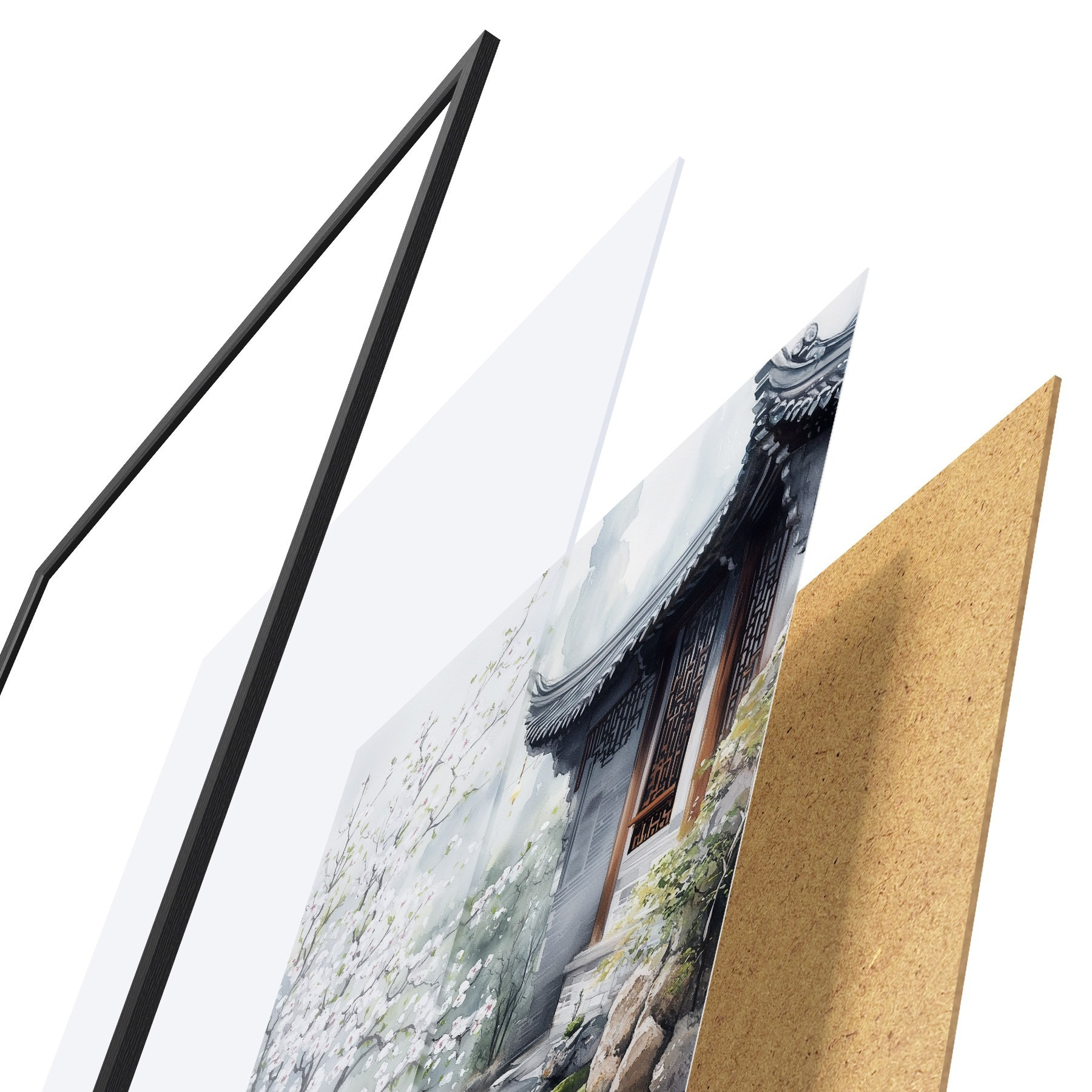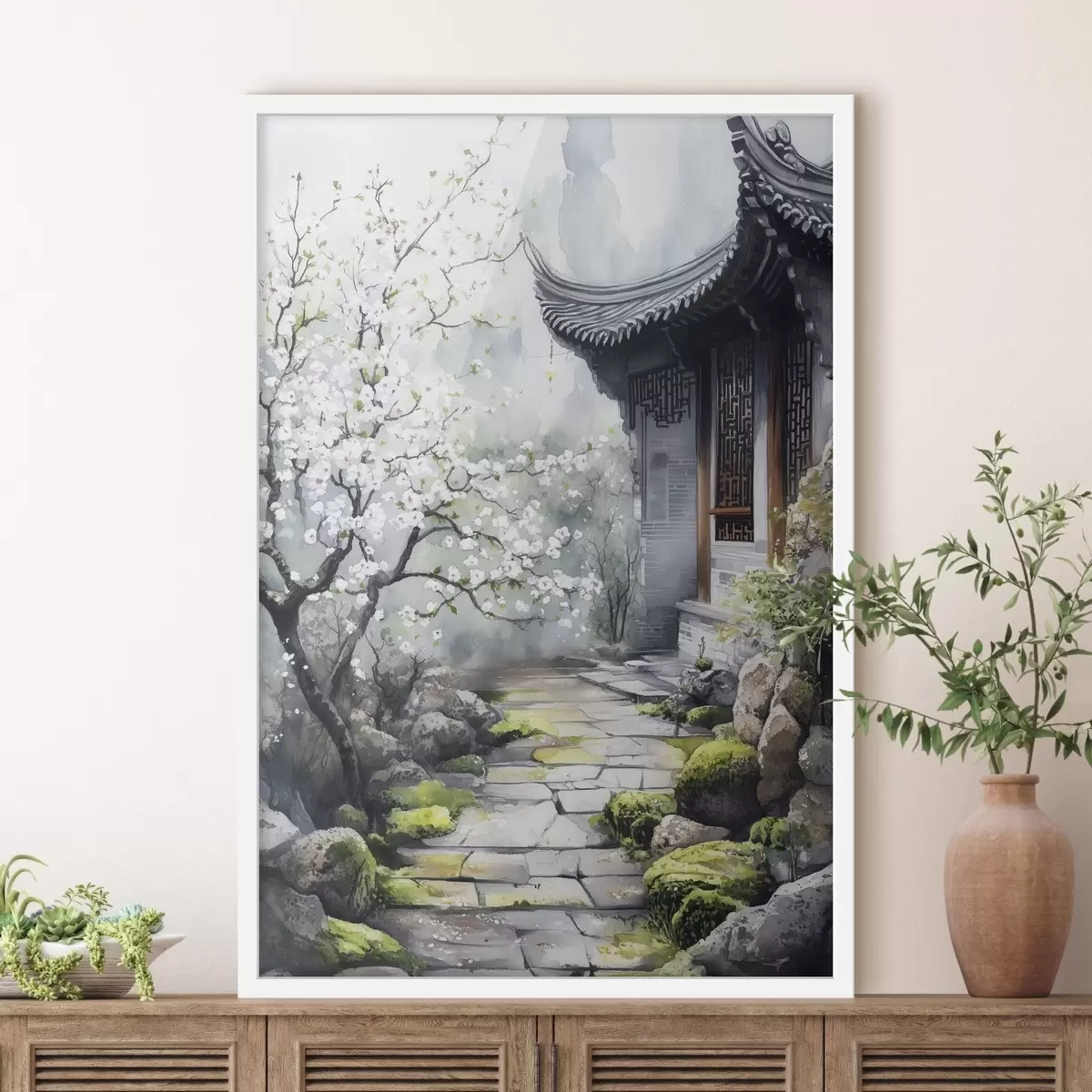 Poster Jaapani aed kirsipuu ja majaga, idamaine, akvarellstiilis Nr f44309