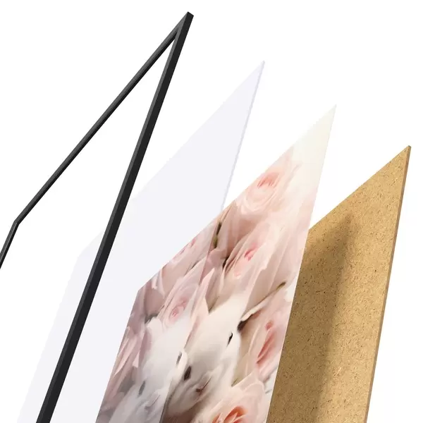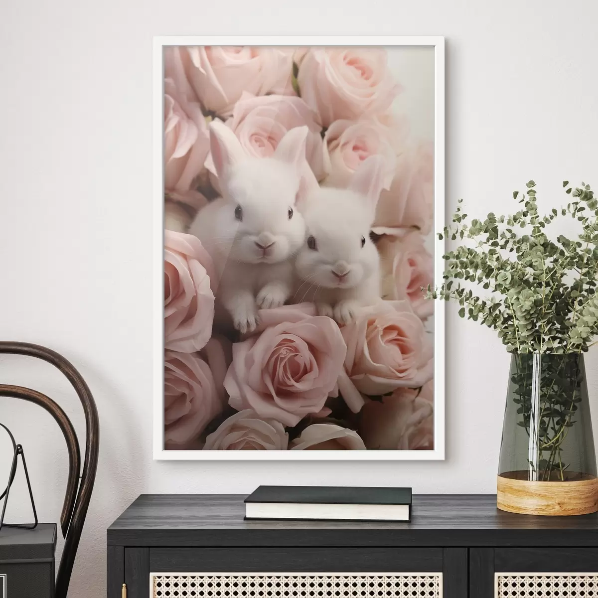 Plakat Kaks valget küülikut õrnade roosililledega f44380