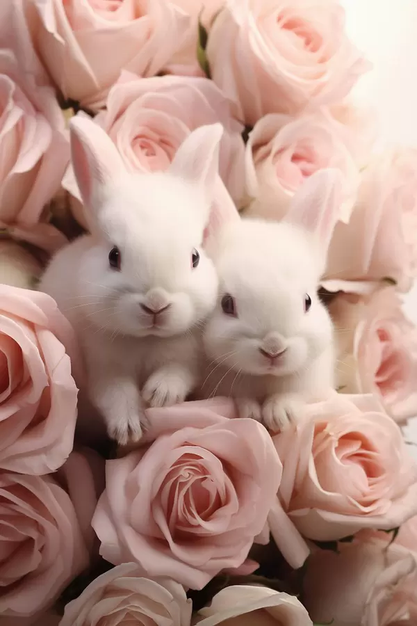 Plakat Kaks valget küülikut õrnade roosililledega f44380