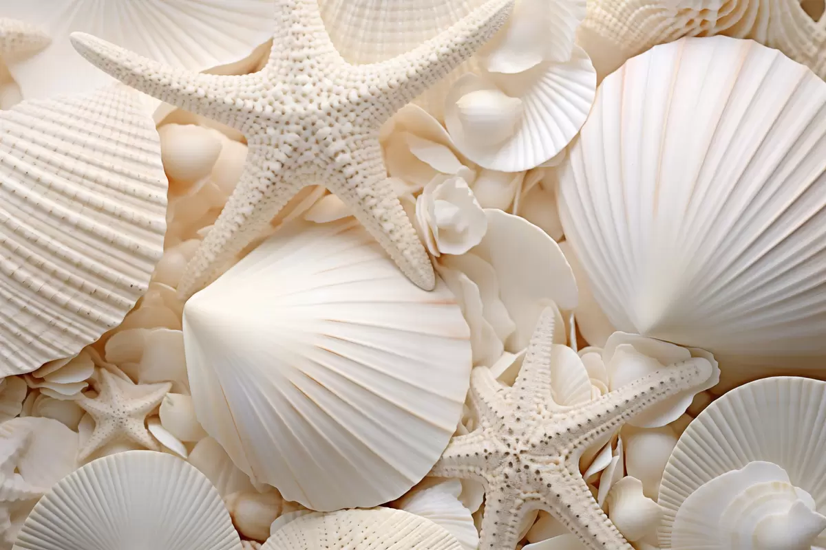 Poster Dekoratiivsed valged merekarbid ja meritähed, mis loovad tekstuurse ühevärvilise kompositsiooni Nr f44392