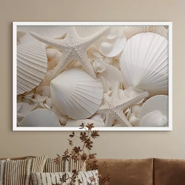 Plakat Dekoratiivsed valged merekarbid ja meritähed, mis loovad tekstuurse ühevärvilise kompositsiooni f44392