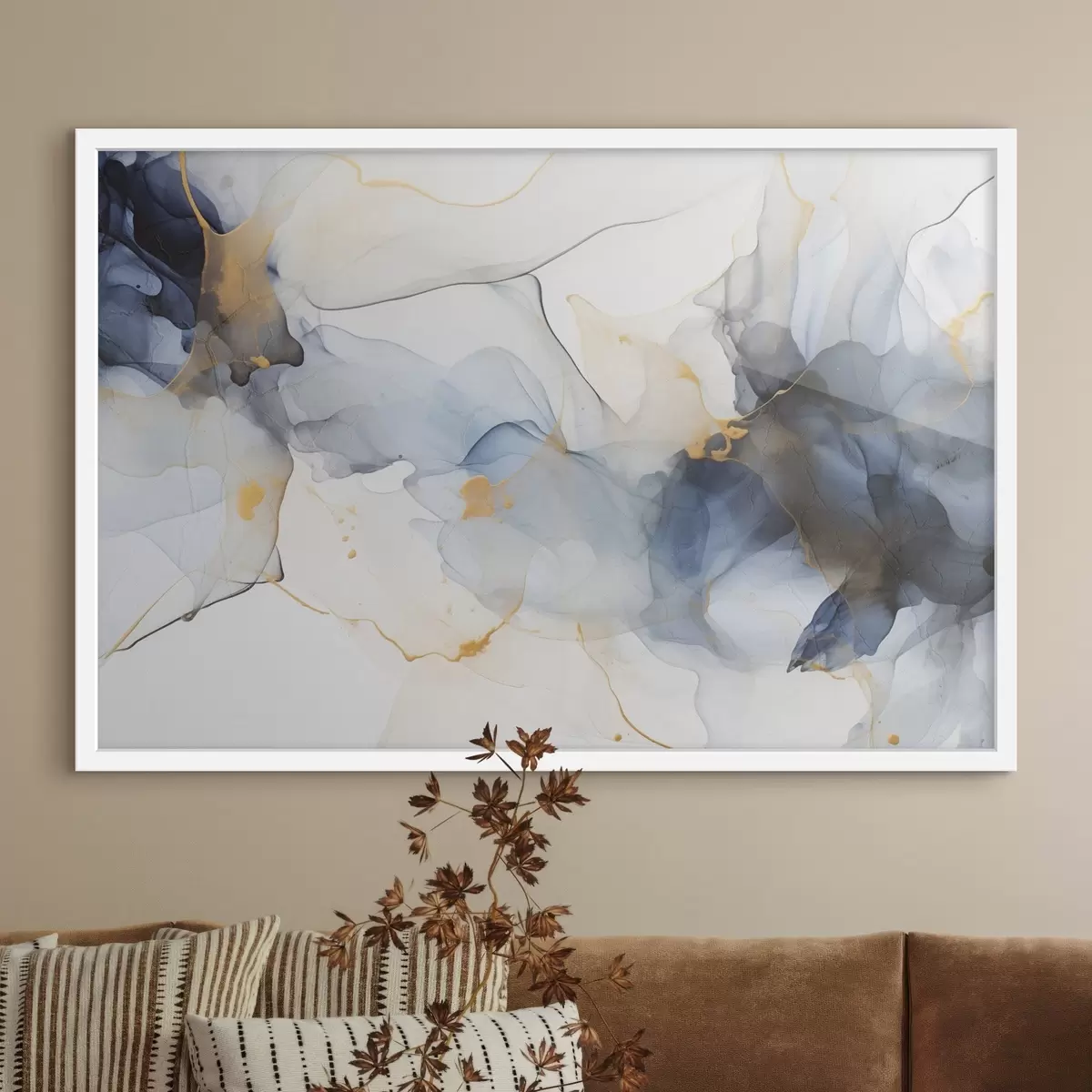 Poster Abstraktne maal sinise tindiga, vedelad ja orgaanilised kujundid, õrnad tekstuurid valgel taustal Nr f44397