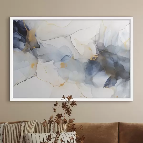 Plakat Abstraktne maal sinise tindiga, vedelad ja orgaanilised kujundid, õrnad tekstuurid valgel taustal f44397