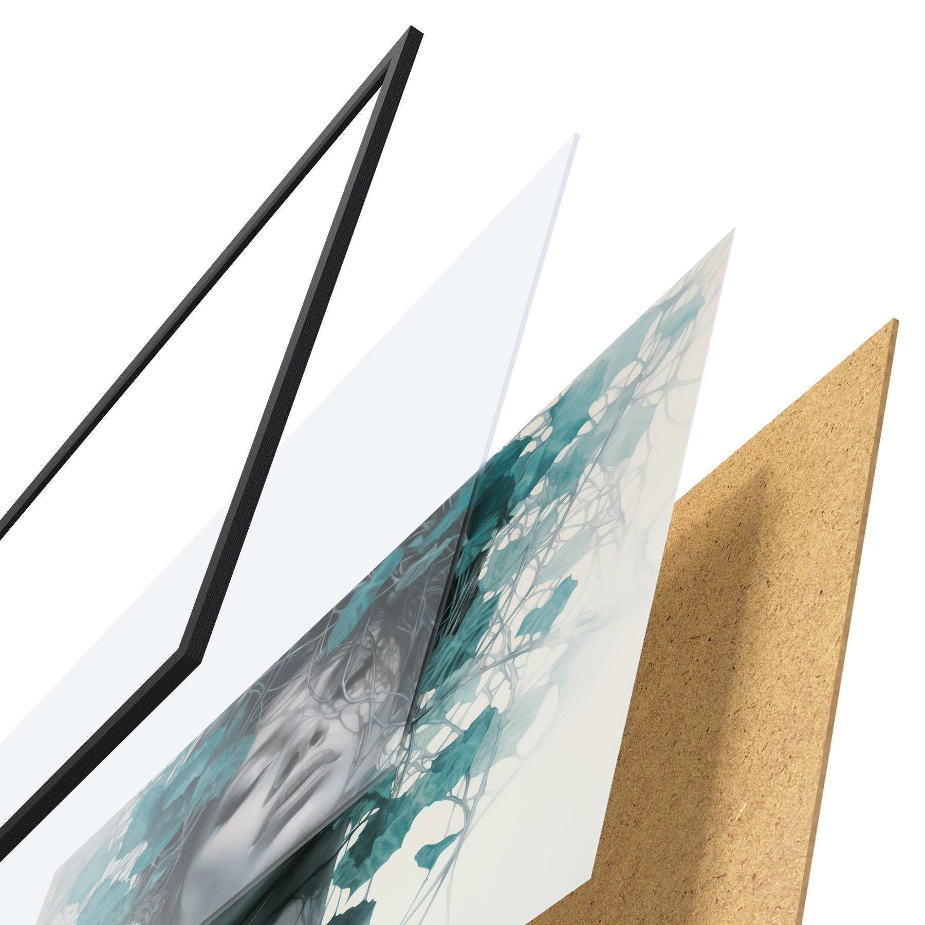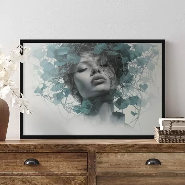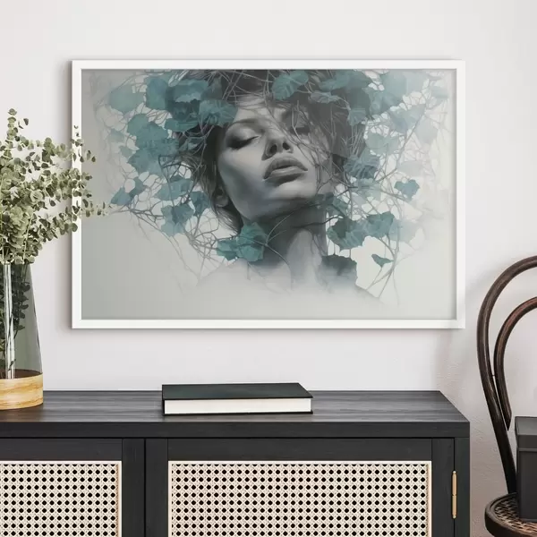 Plakat Suletud silmadega naise portree, ümbritsetud roheliste lehtede ja okstega f44399