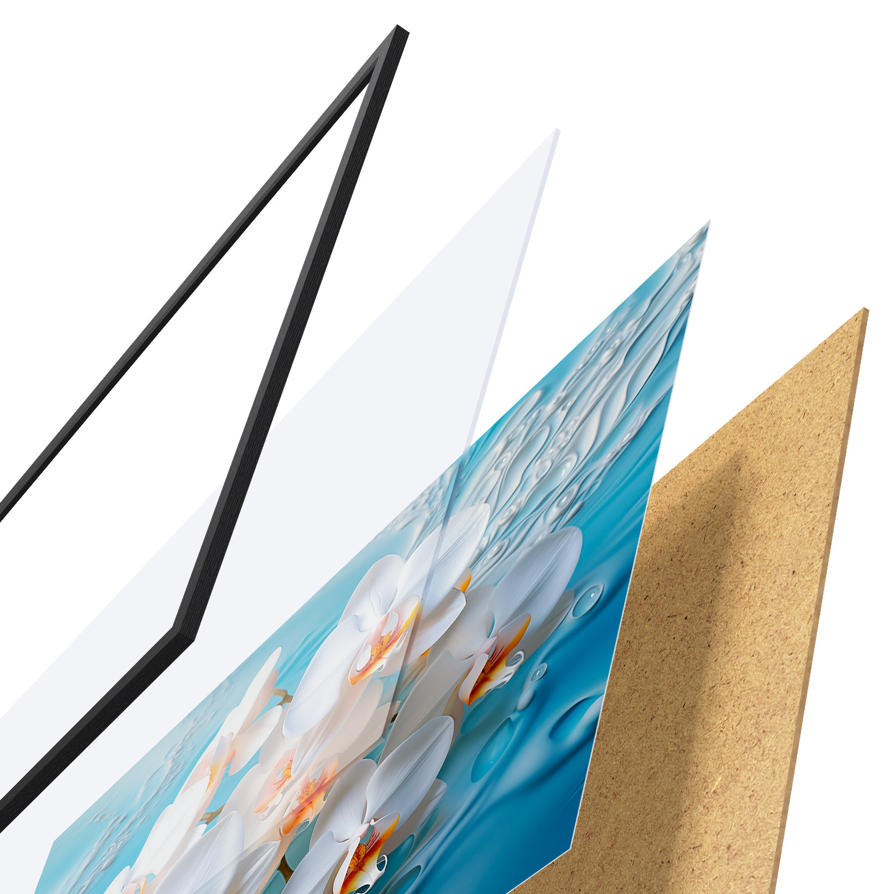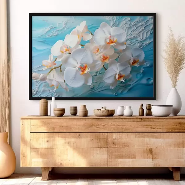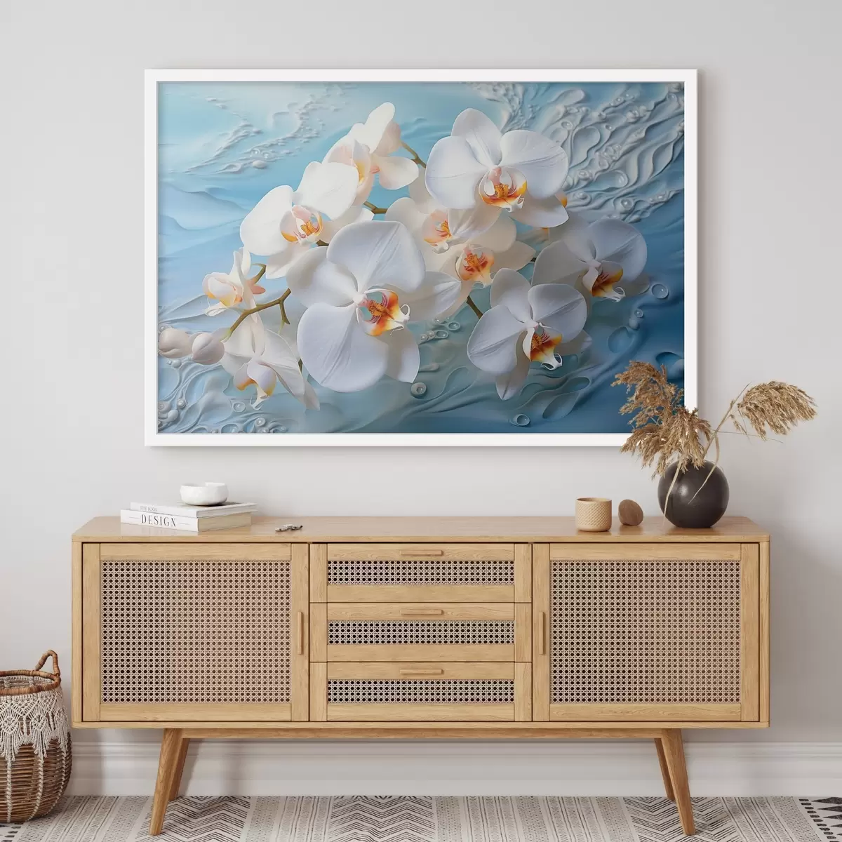 Plakat Valged orhideed, paigutatud helesinisele pinnale veetilkadega, pehme valgustus f44401