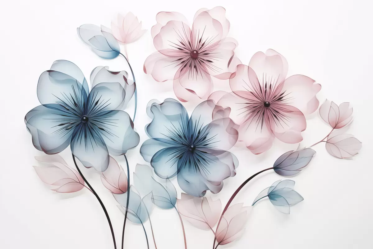 Plakat Läbipaistvad roosad ja sinised õied, mille õied ja varred on nähtavad f44405
