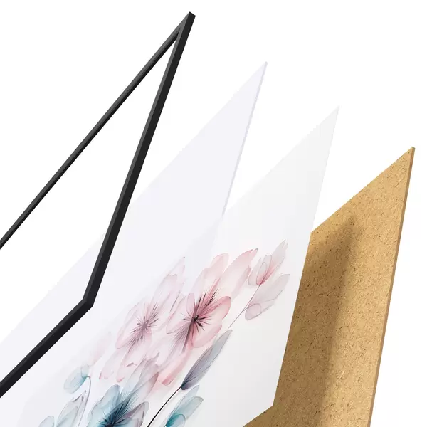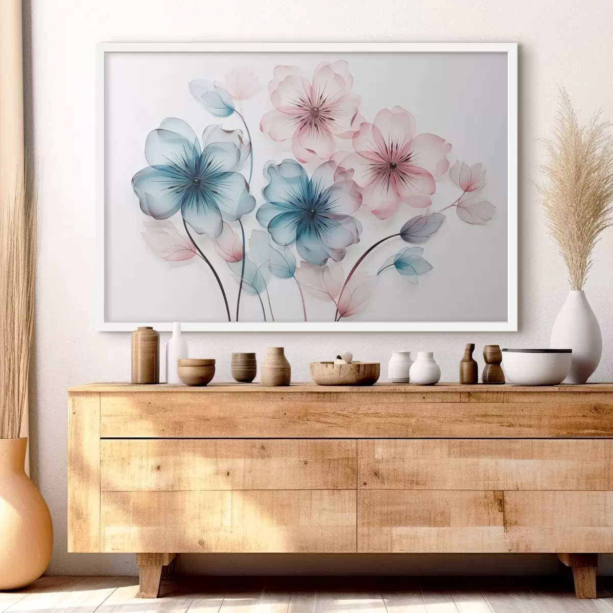 Poster Läbipaistvad roosad ja sinised õied, mille õied ja varred on nähtavad Nr f44405