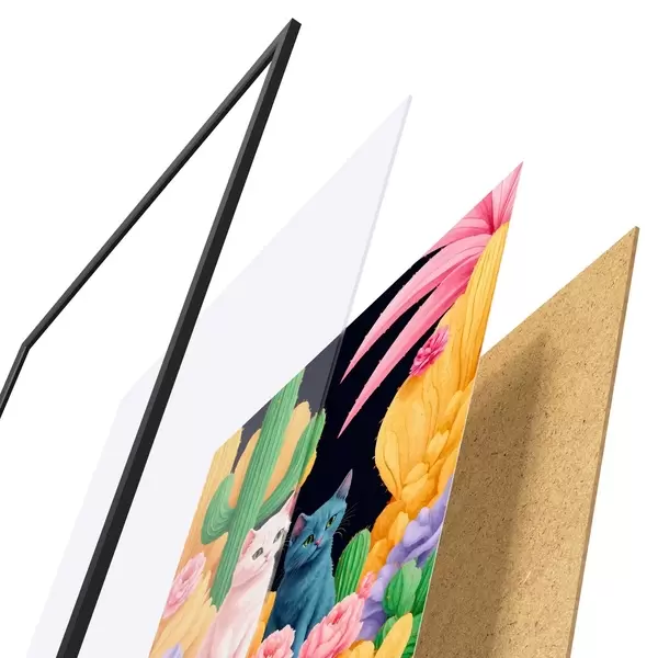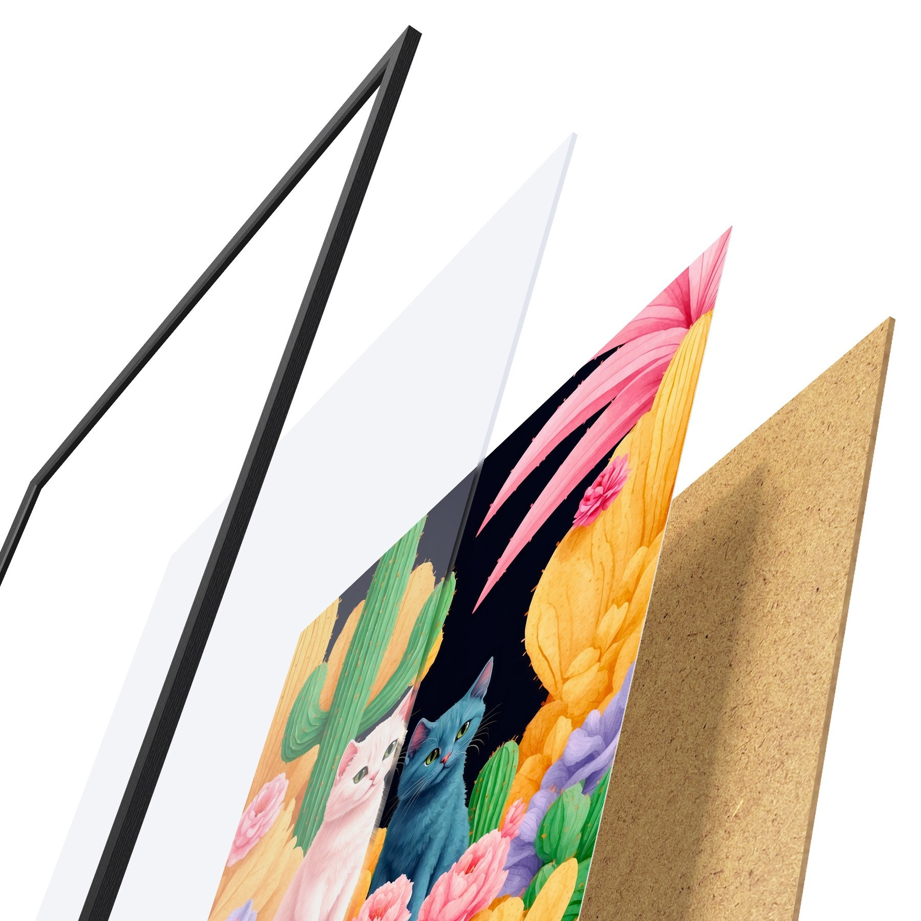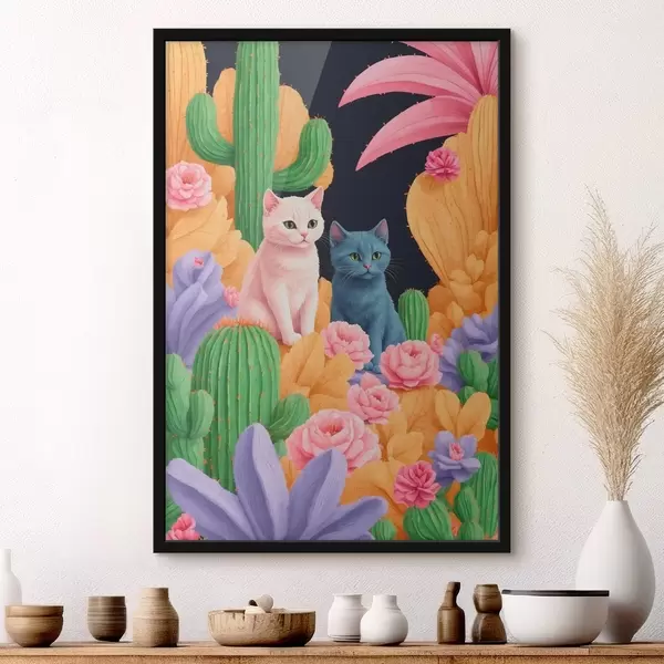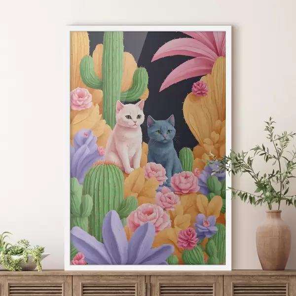Plakat Kunstlikud kassid lillede ja kaktuste vahel f44452