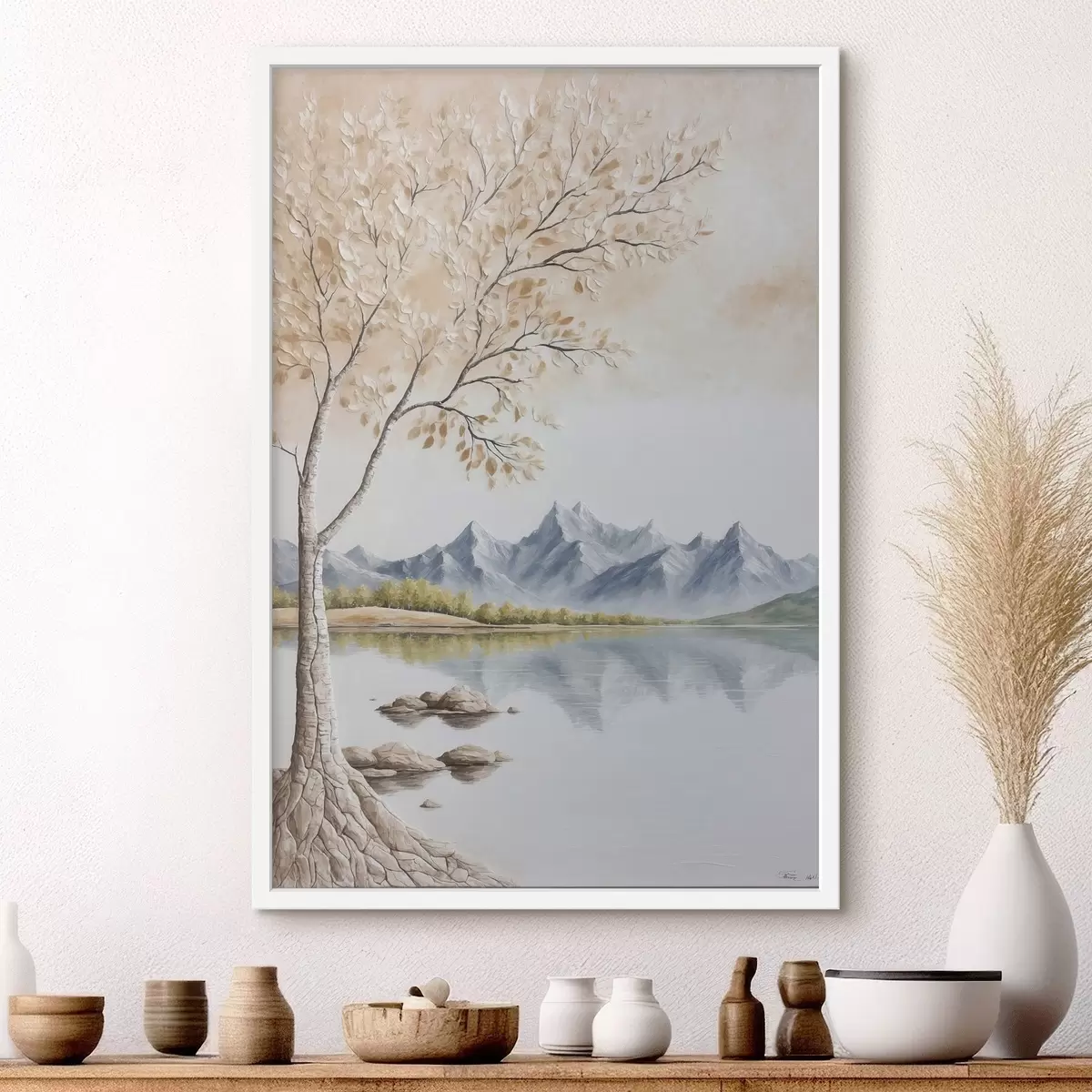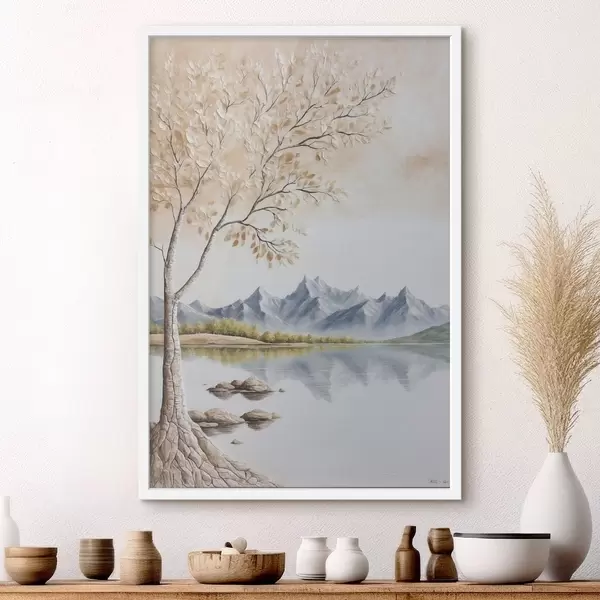 Plakat Puu järvel ja lumised mäed taustal f44459