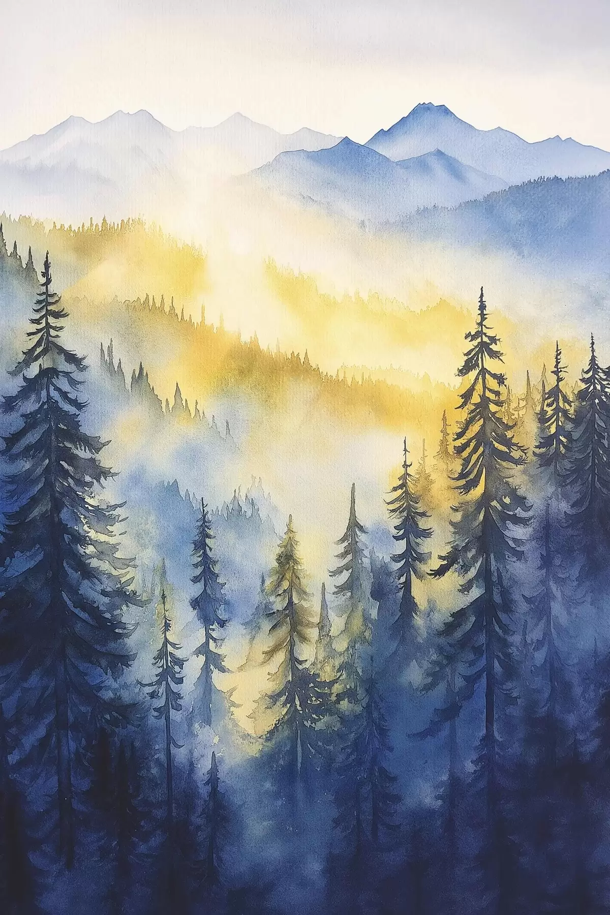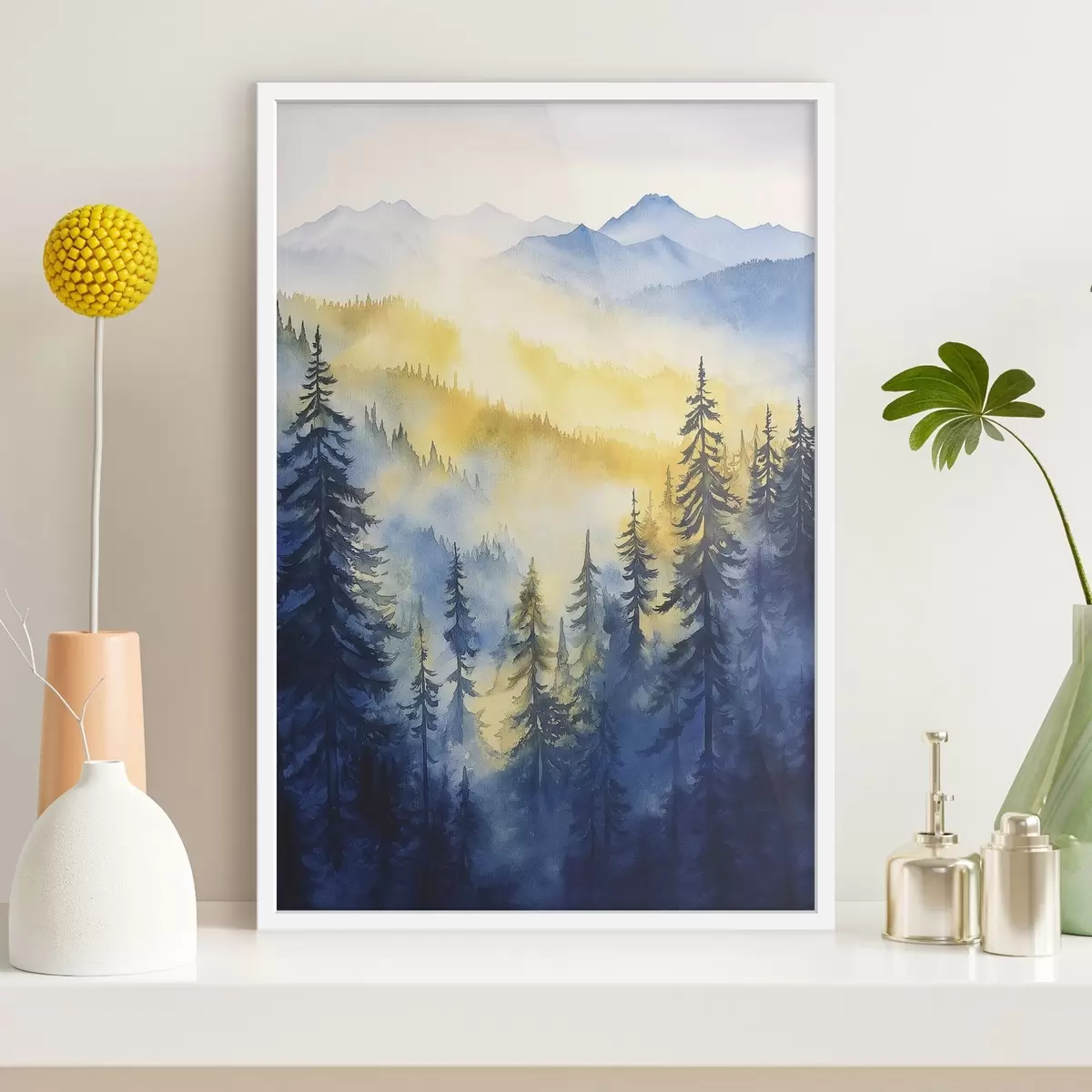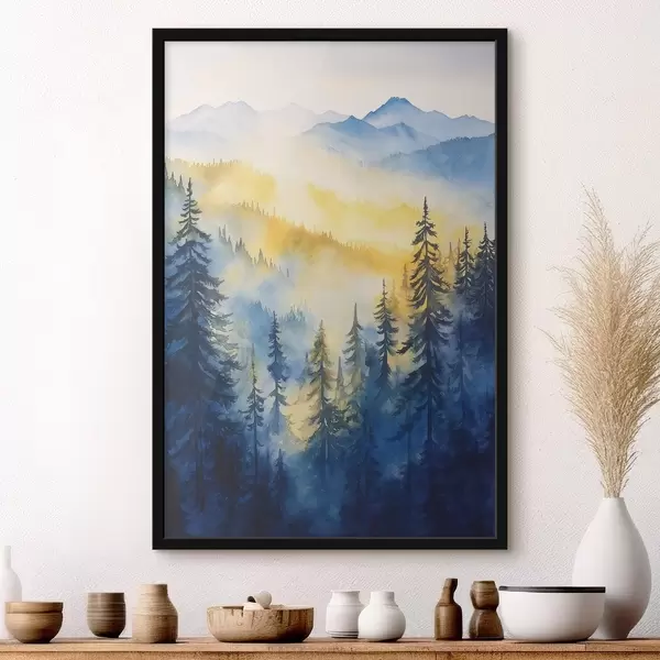 Poster Udusad mäed päikesetõusul, mändide esised, sinised ja kollased värvid Nr f44602