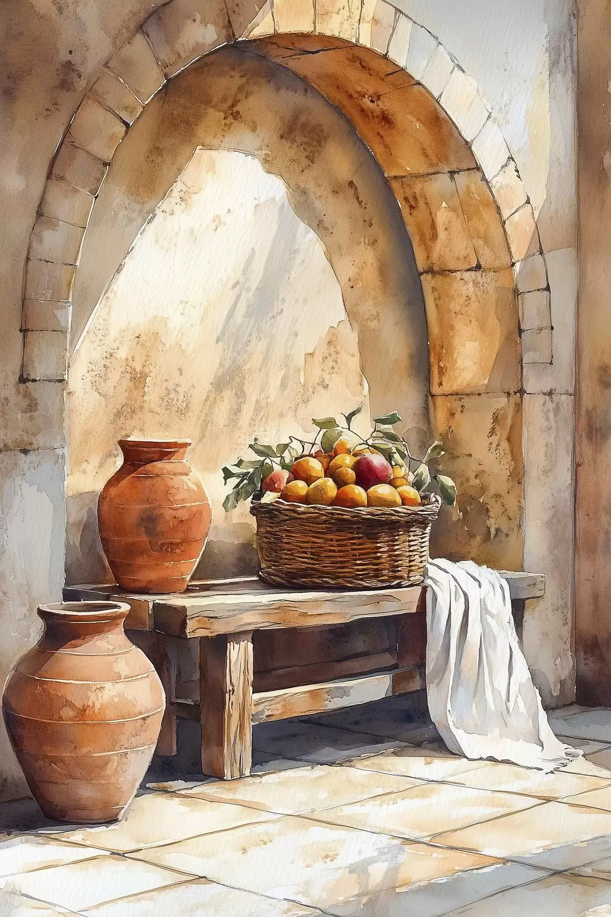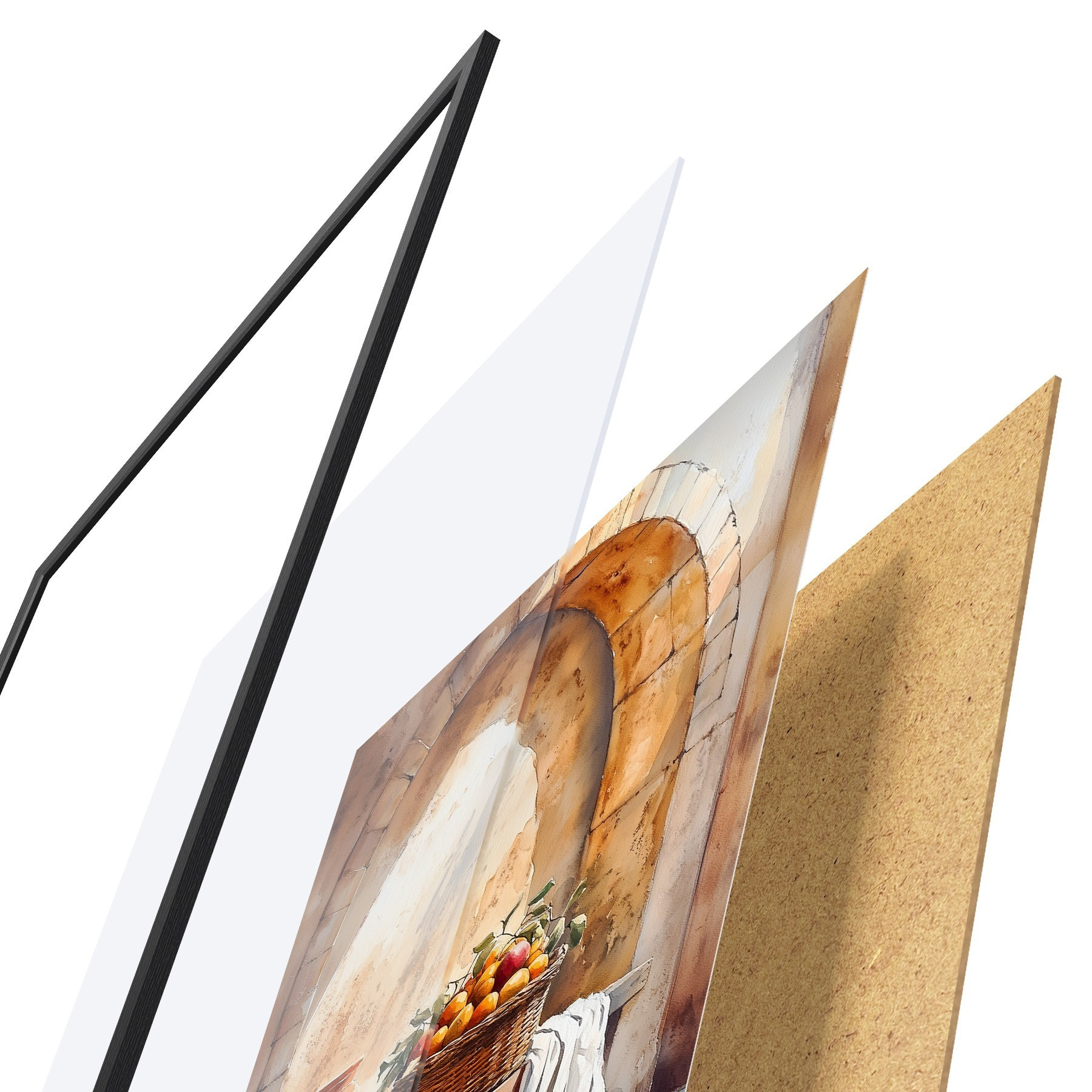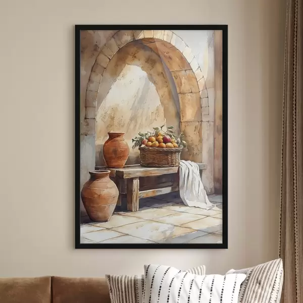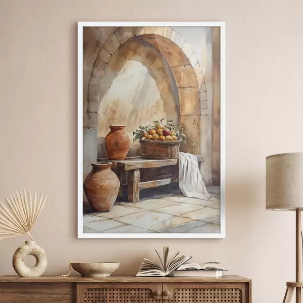 Poster Esteetilised vaasid ja punutud korv apelsinidega, Toscana, rustikaalne stiil Nr f44605