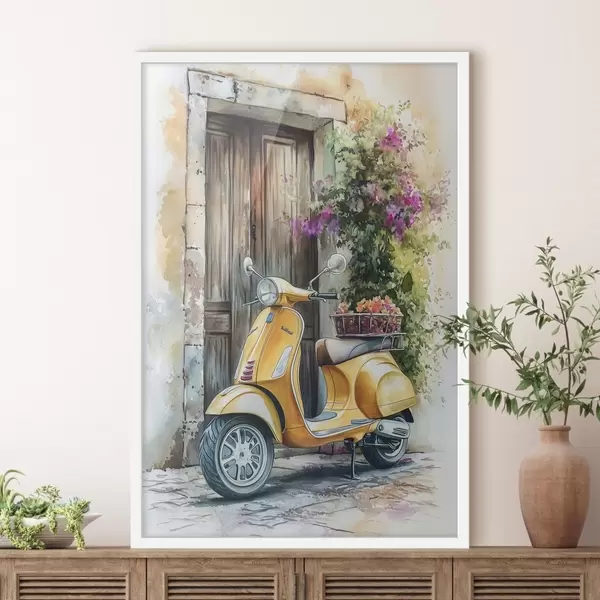 Plakat Kollane Vespa roller lilledega puidust ukse juures f44607