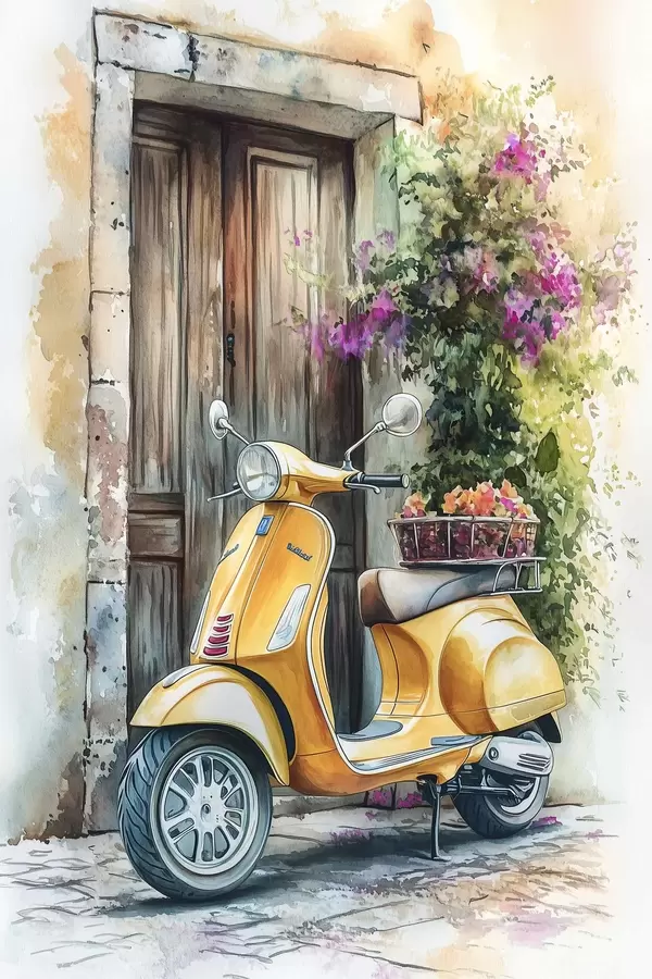 Plakat Kollane Vespa roller lilledega puidust ukse juures f44607