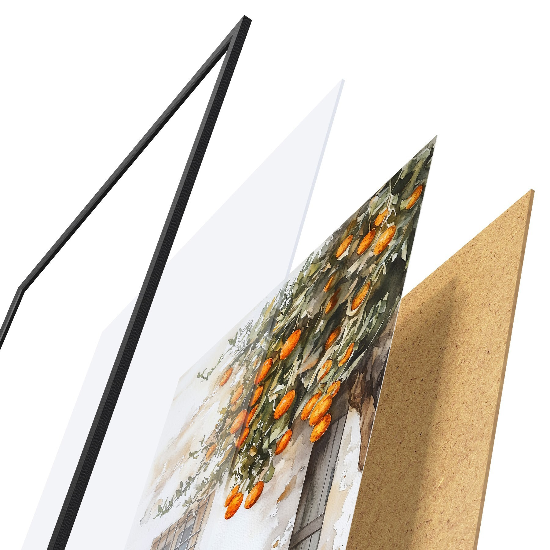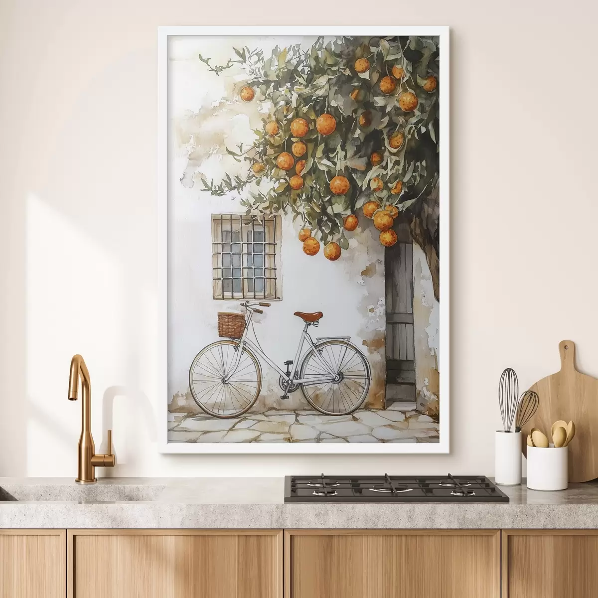 Plakat Vahemereline valge maja koos apelsinipuu ja jalgrattaga f44610