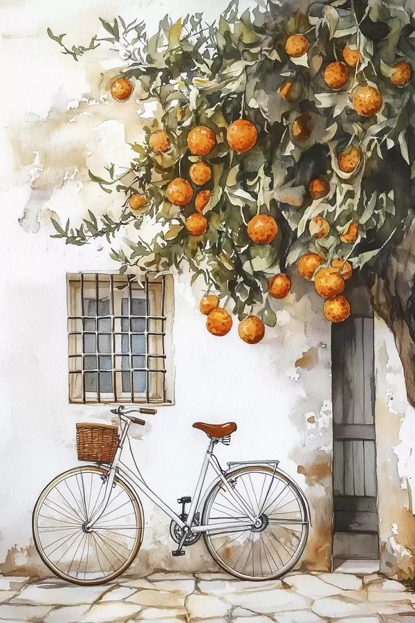 Plakat Vahemereline valge maja koos apelsinipuu ja jalgrattaga f44610