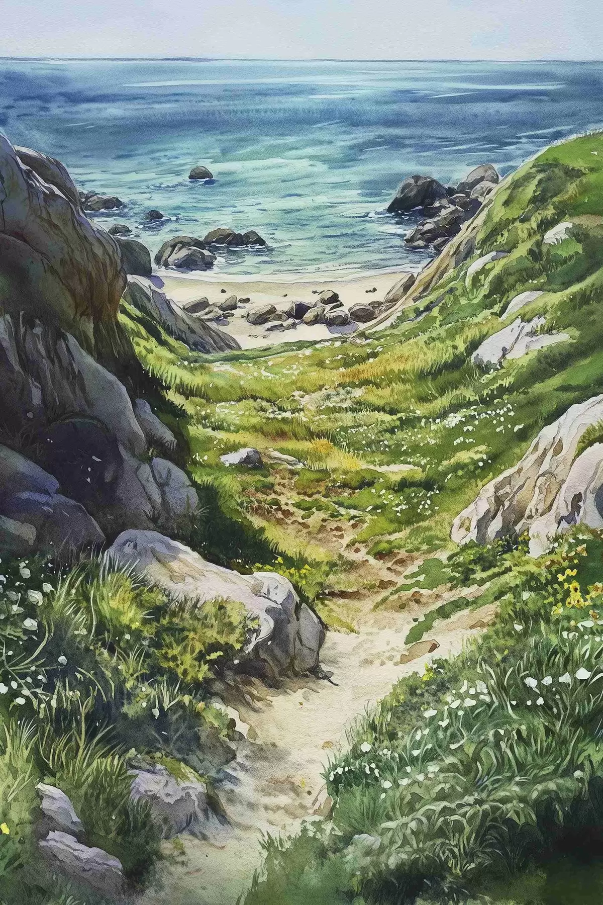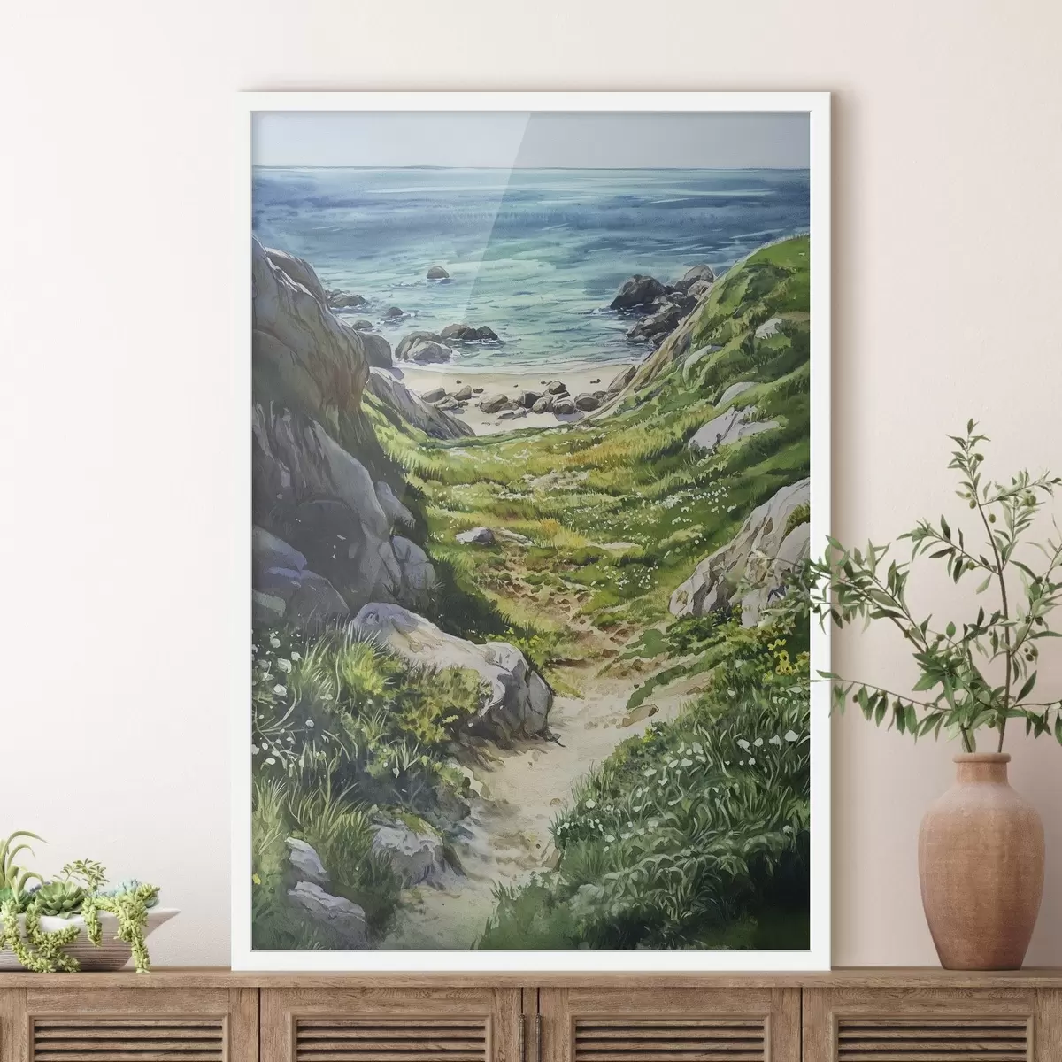 Poster Mererannik koos kivide ja rohelise rohuga, akvarellstiilis, suvi Nr f44616